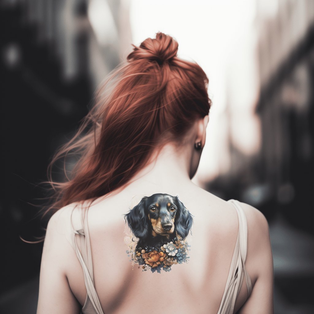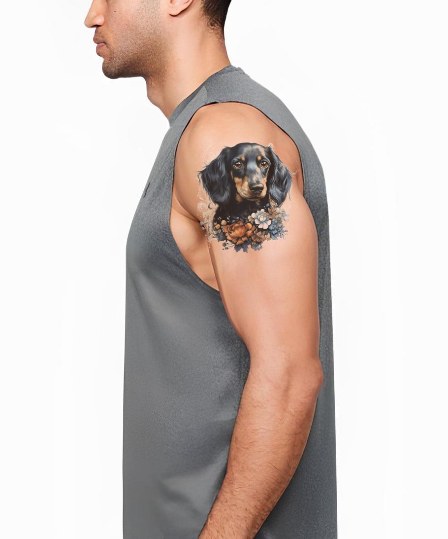 Desenho de Tatuagem de Cachorrinho Daschund com Flores