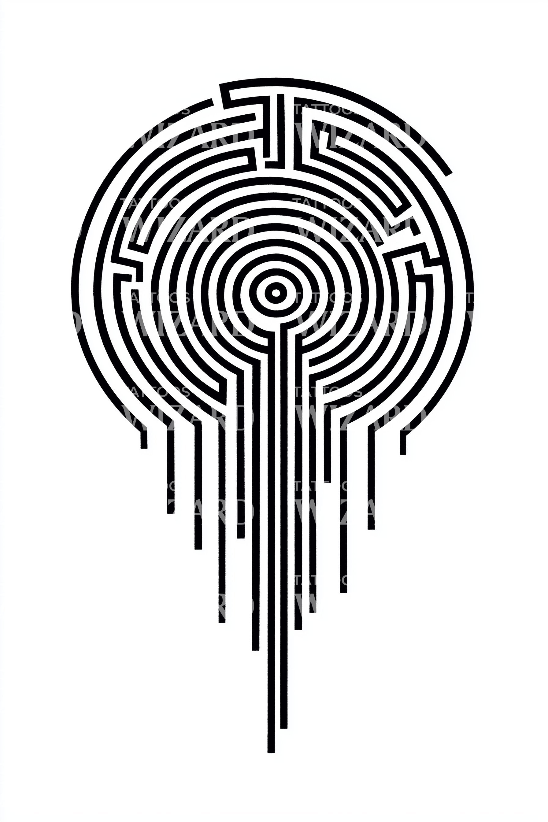 Revele uma viagem ao desconhecido com este desenho de tatuagem escuro e abstrato. Os padrões geométricos habilmente elaborados criam um labirinto intricado, conduzindo a uma fechadura misteriosa. Características dinâmicas de gotejamento adicionam um toque não convencional, infundindo o desenho com uma borda distinta. Este labirinto hipnotizante é tanto um enigma quanto uma obra-prima.