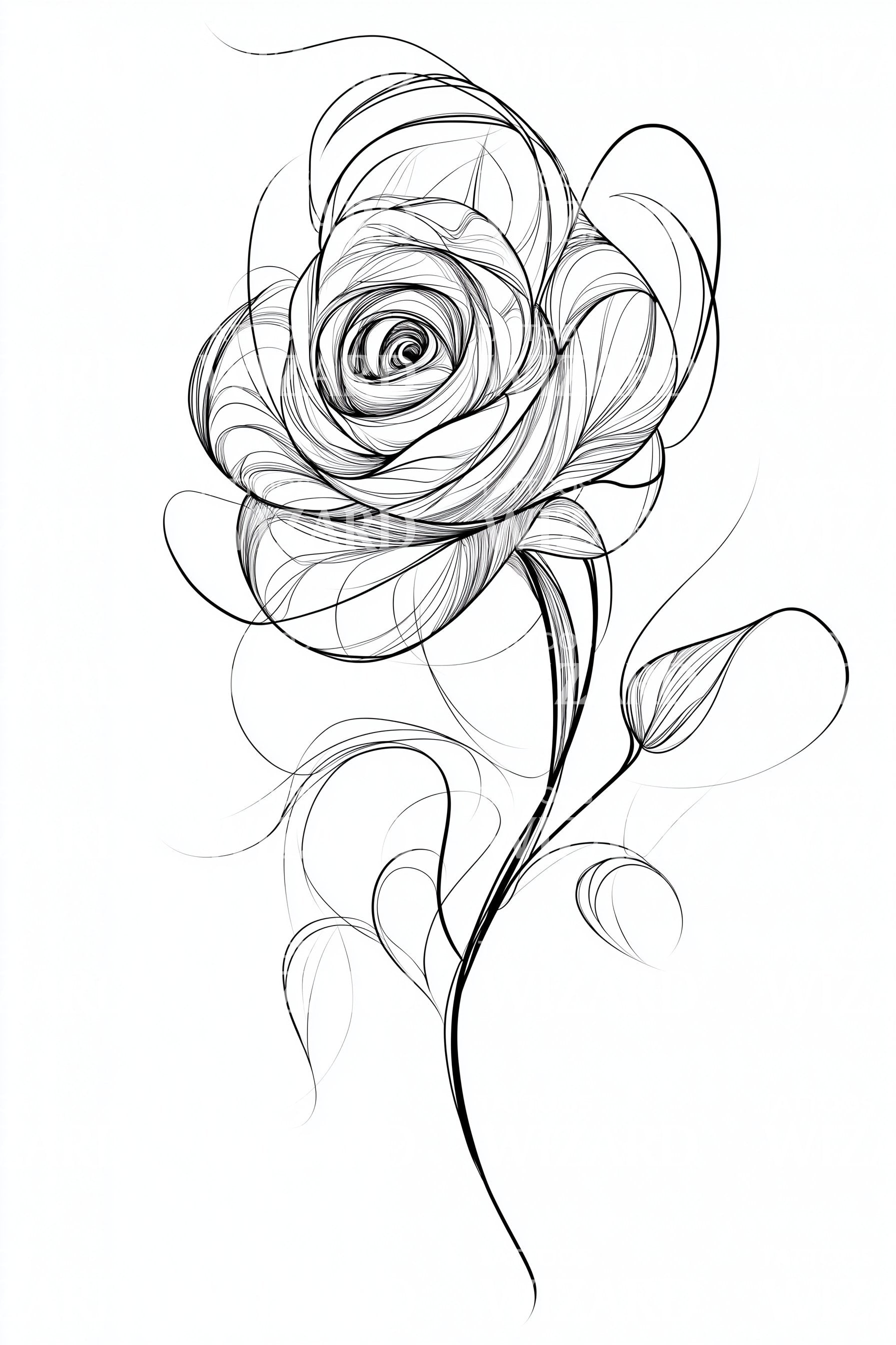 Fineline rose sketched in airy, tangled lines; petals spiral softly above a slender minimal stem with whimsical curls. Symbol of resilient love and renewal, it whispers grace and quiet strength. Feels like breath and poetry on skin. Forearm for visibility, ribs to hug curves, spine for line, calf for stride.