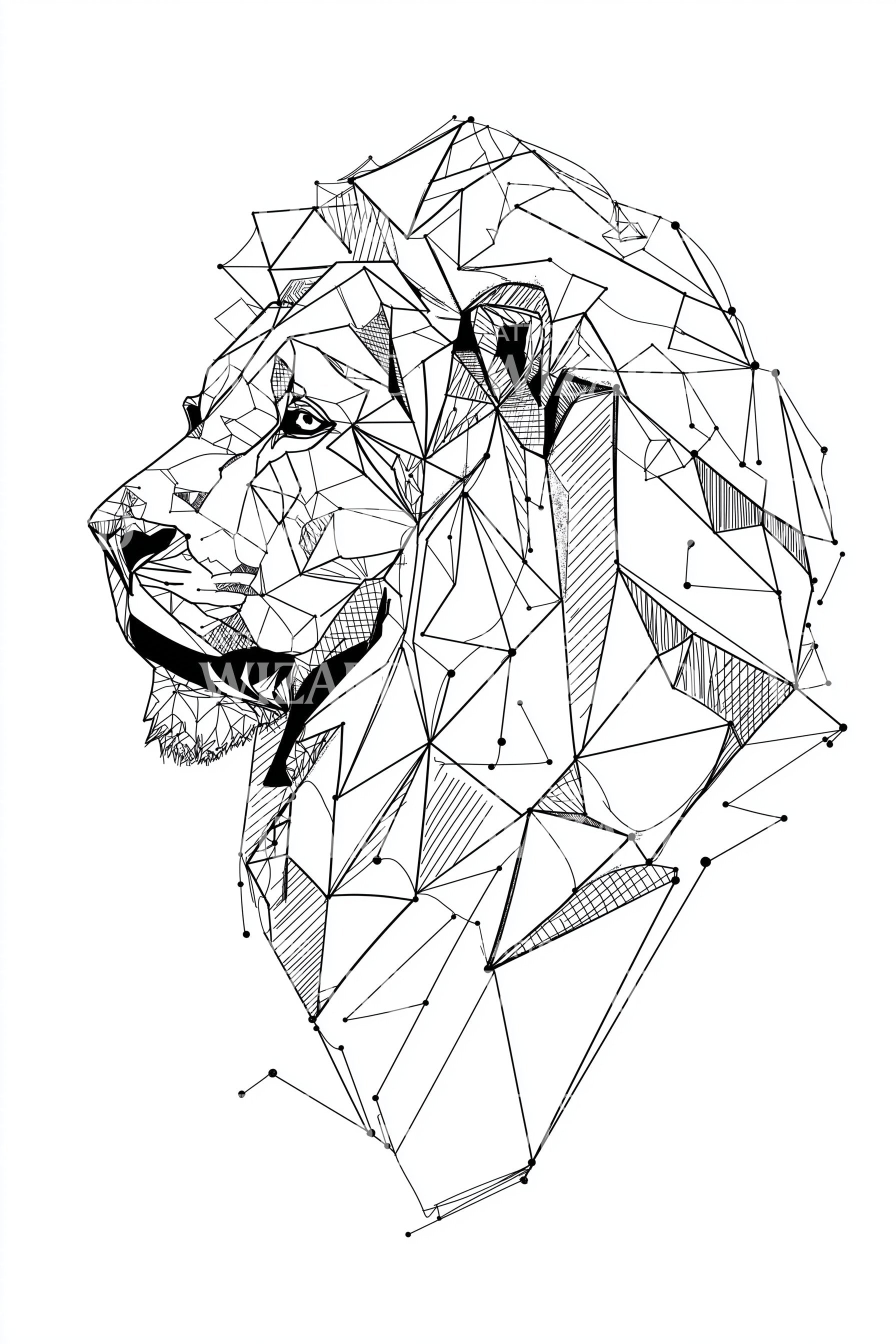 Descubra a sua força interior com este desenho de tatuagem de perfil de leão. É um esboço em wireframe que combina artisticamente poder e geometria, para criar uma obra-prima hipnotizante. O ponto focal é o majestoso leão, que personifica poder e destemor, perfeito para os corajosos.