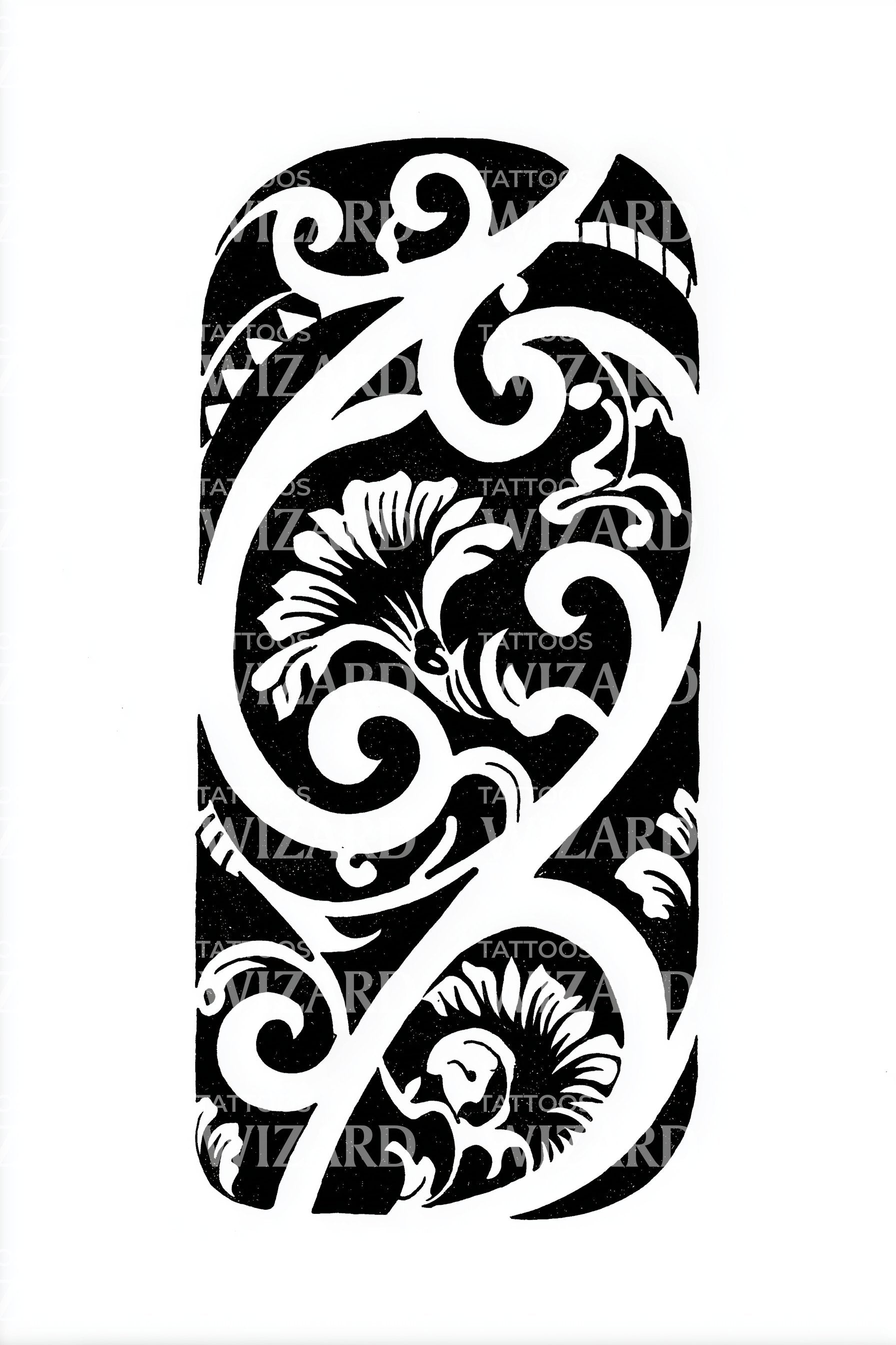 Mergulhe nas raízes profundas da cultura Maori com este desenho de tatuagem tribal. Exibindo um padrão preto marcante, combina os tradicionais redemoinhos Maori com um toque de detalhes florais, criando um painel cativante que certamente atrairá olhares. Expresse a sua individualidade e força com esta peça sóbria.
