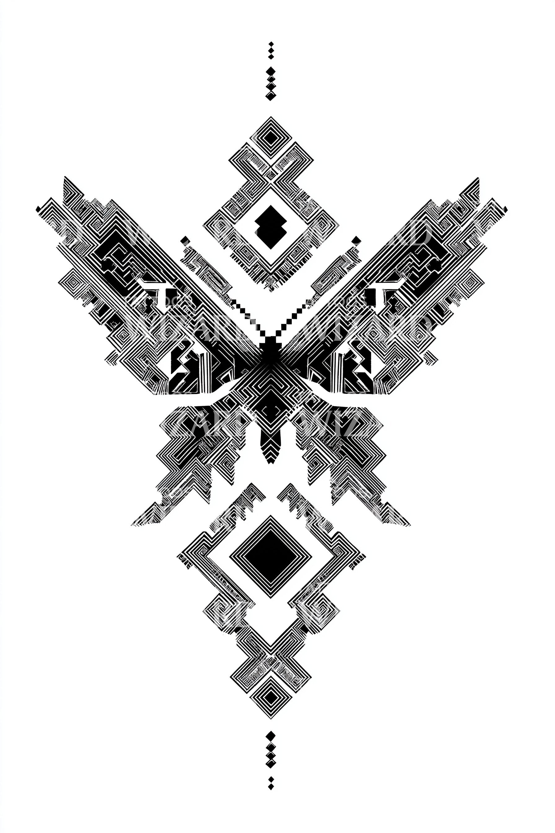 Adorne a sua pele com o nosso design de tatuagem de traça geométrica. Apresentando uma simetria especializada e padrões tribais intrincados, esta peça totem impressionante harmoniza belamente a tradição com a modernidade. Uma adição exclusiva para quem procura um apelo distintivo e intemporal na sua coleção de arte corporal.