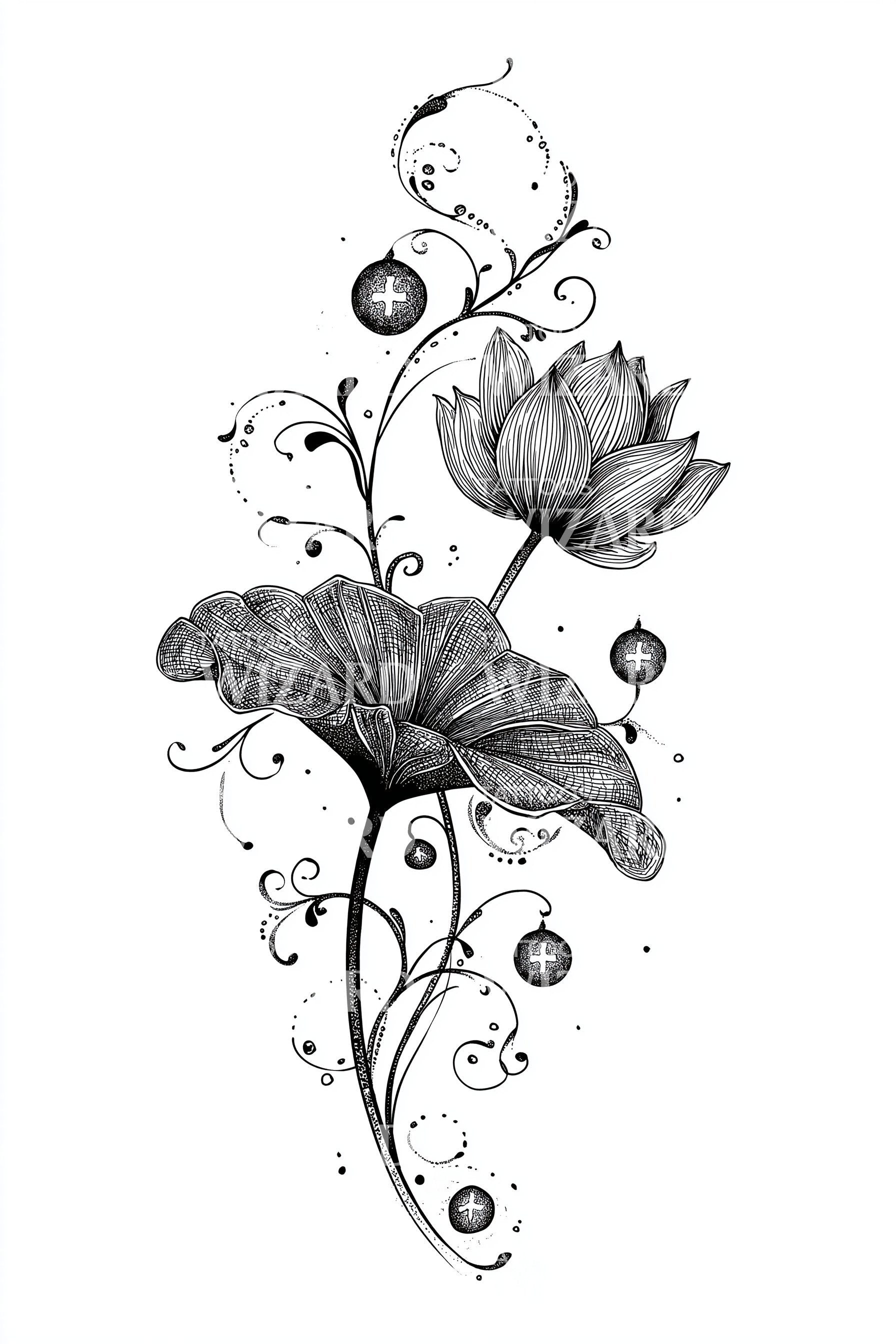 Mergulhe no reino da arte de fusão com este design de tatuagem surreal e ilustrativo. Incorporando uma mistura perfeita de natureza e fantasia, combina elementos do lótus sagrado e de um cogumelo fantástico. Este design é um convite cativante à conversa, unindo realidade e imaginação com elegância.
