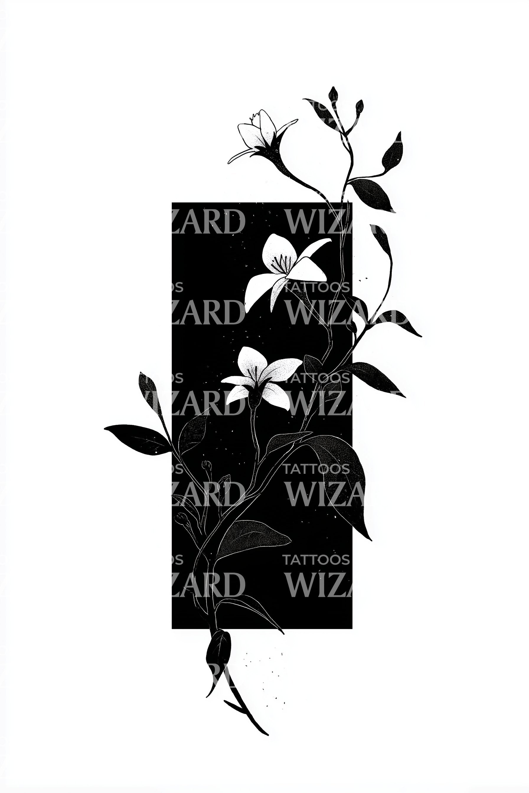 Este design de tatuagem minimalista apresenta uma elegante orquídea preta, lindamente encapsulada numa moldura elegante. O espaço negativo confere uma sensação etérea, realçando a elegância floral. Perfeito para amantes da simplicidade que desejam gravar um toque de flora delicada na sua pele.