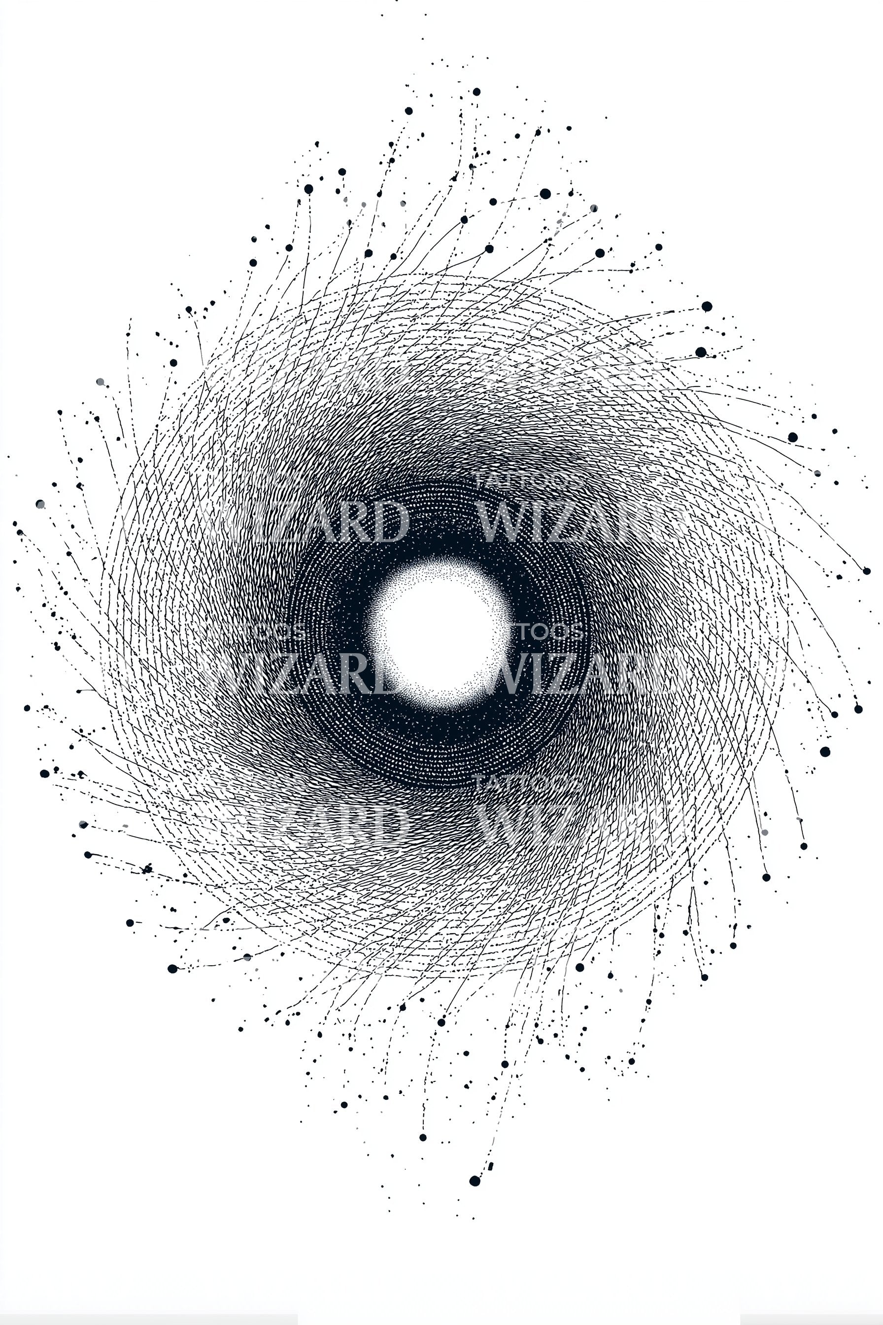 Sinta o cosmos na sua pele com este desenho de tatuagem em dotwork. As suas partículas radiais formam um anel toroidal, criando um campo cativante que lembra uma galáxia distante. Uma escolha requintada para quem é fascinado pelo universo e pela sua mística celestial. Ideal para amantes de arte corporal única e imaginativa.