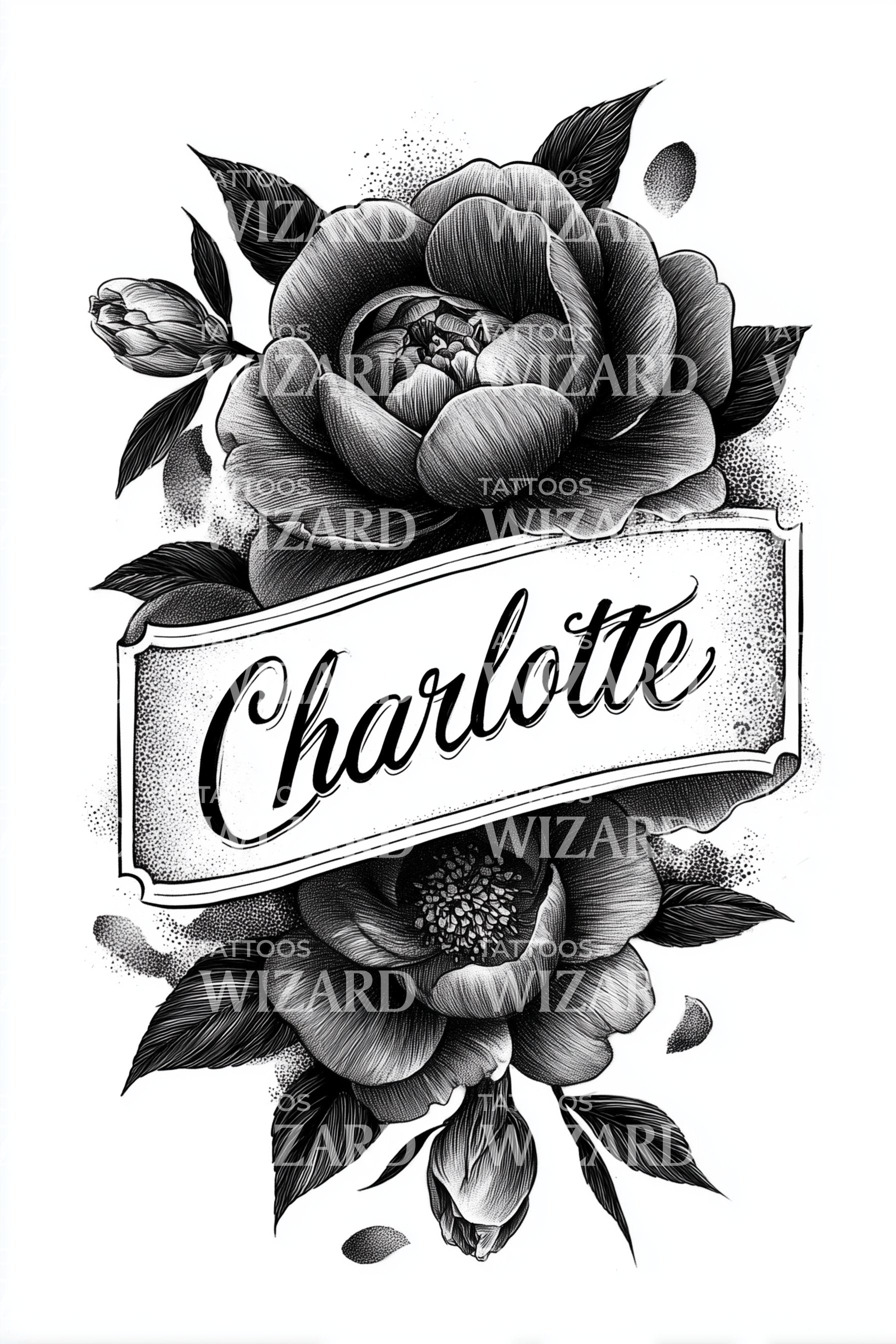 Velvety peonies and bold leaves cradle the name Charlotte in a graceful banner, rendered in blackwork and soft stipple. Peony whispers prosperity, romance, and renewal; leaves speak of growth and protection. Wearing it feels grounded, cherished, and quietly radiant, a botanical vow to bloom through every season of grace.