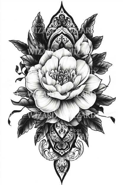 Desenho de Tatuagem Clássica Ornamental de Peônia