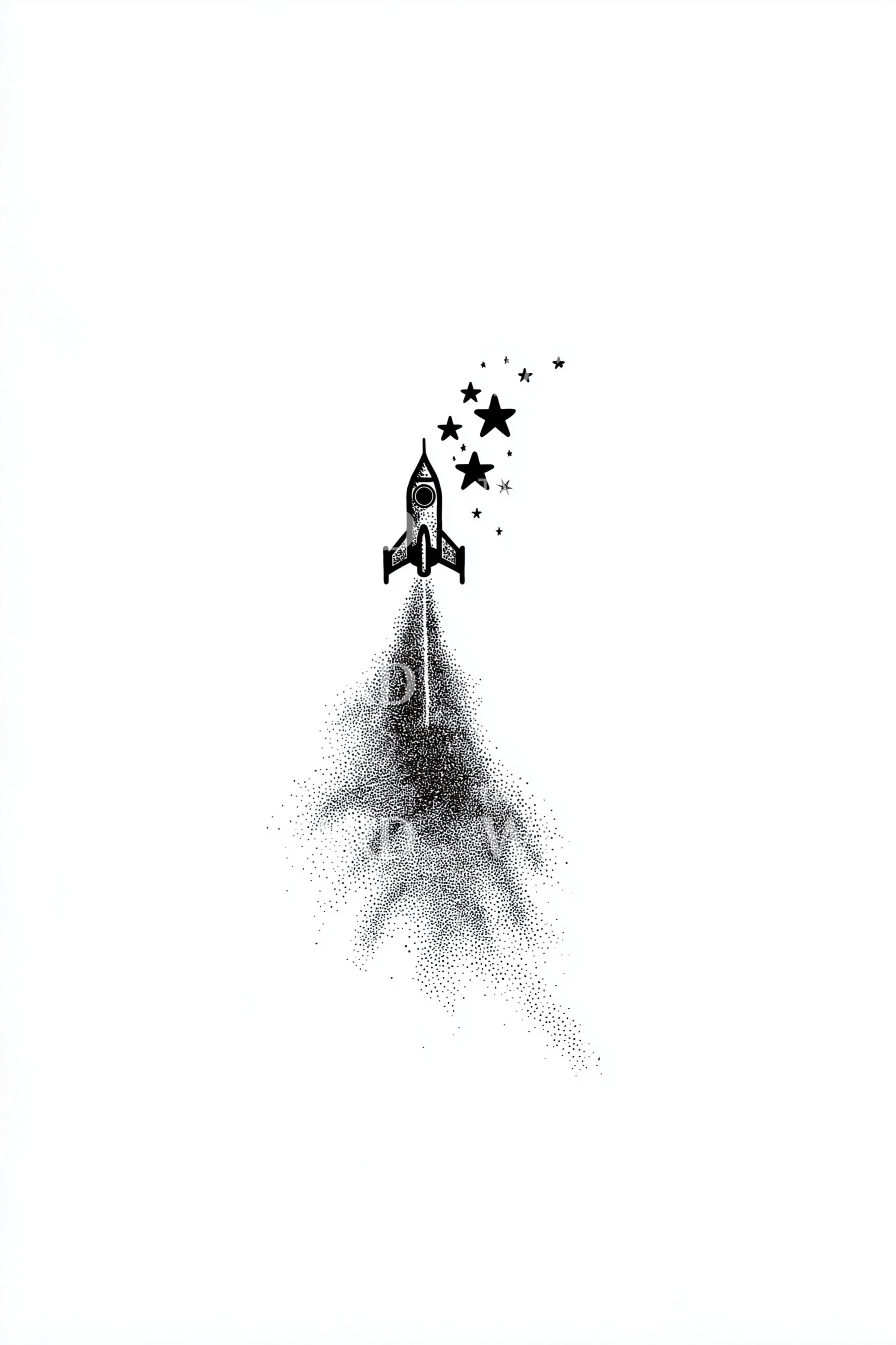 Mini rocket lifts from a cloud of stippled smoke, crisp black lines guiding a trail of tiny stars into open space. Minimal yet bold, it marks beginnings, courage, and quiet ambition. Wearing it feels like a private countdown, a steady launch toward personal orbits and limitless horizons.