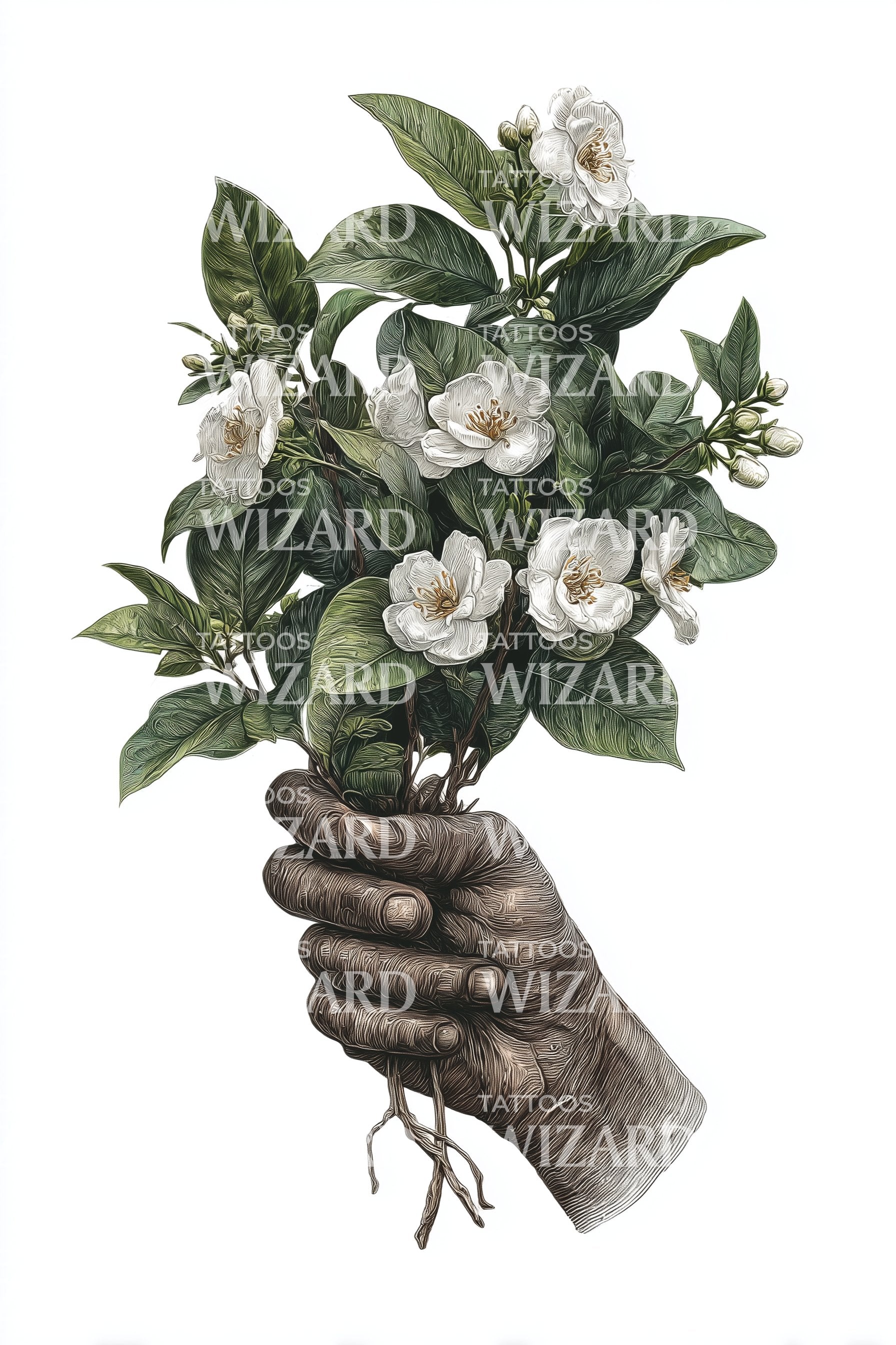 Mergulhe na beleza rústica deste design de tatuagem realista. Uma representação vívida de uma mão segurando um bouquet floral, capturando graciosamente a essência da beleza natural. Este design simboliza o cuidado com a vida e a apreciação da serenidade da natureza selvagem de forma sofisticada e expressiva.