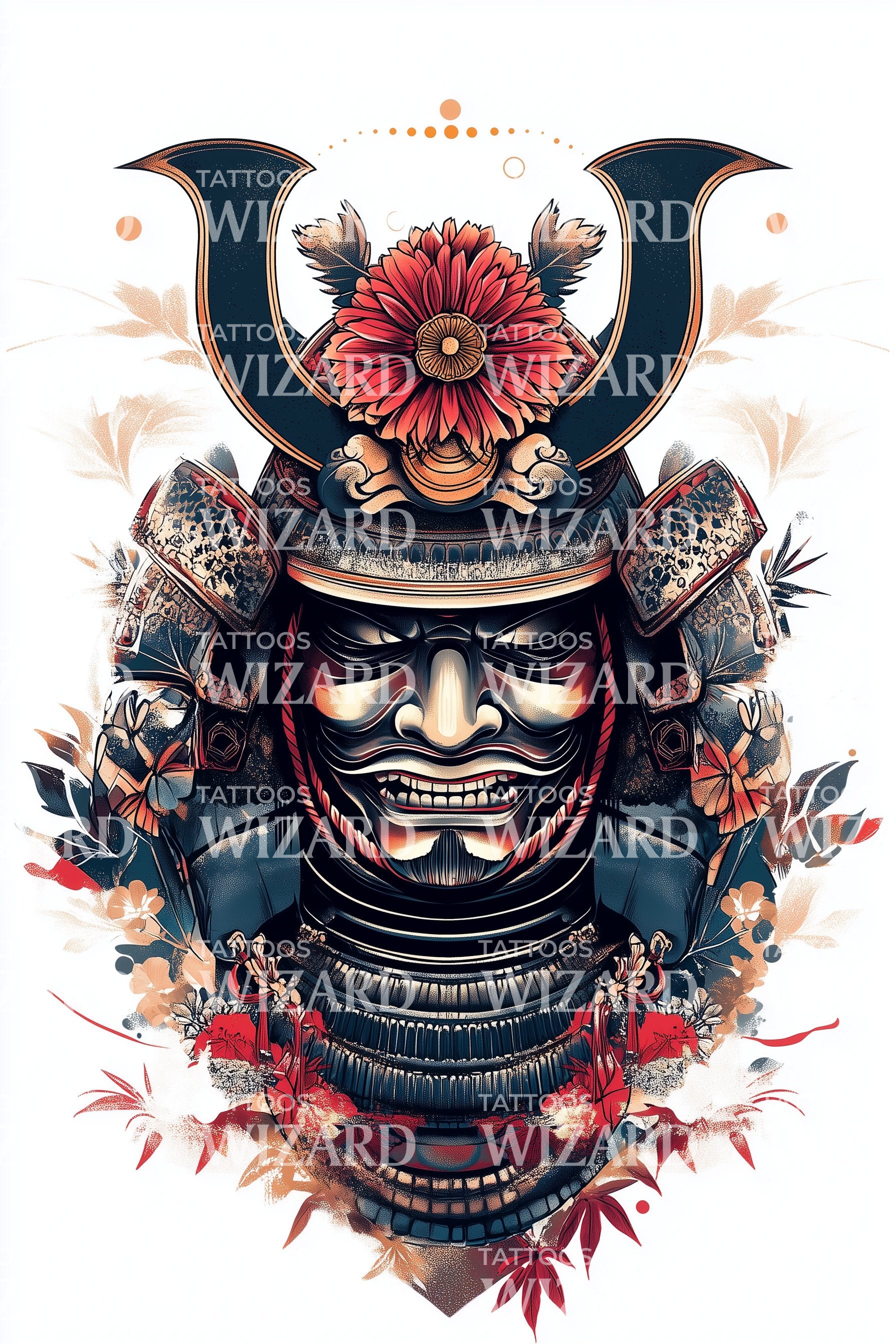 Liberta o teu guerreiro interior com este design de tatuagem neotradicional. Apresentando um Samurai corajoso, mascarado e adornado com uma armadura japonesa detalhada, está envolto por um vibrante fundo floral. Cada traço significa bravura e nobreza, tornando este design um testemunho notável da cultura dos guerreiros japoneses.