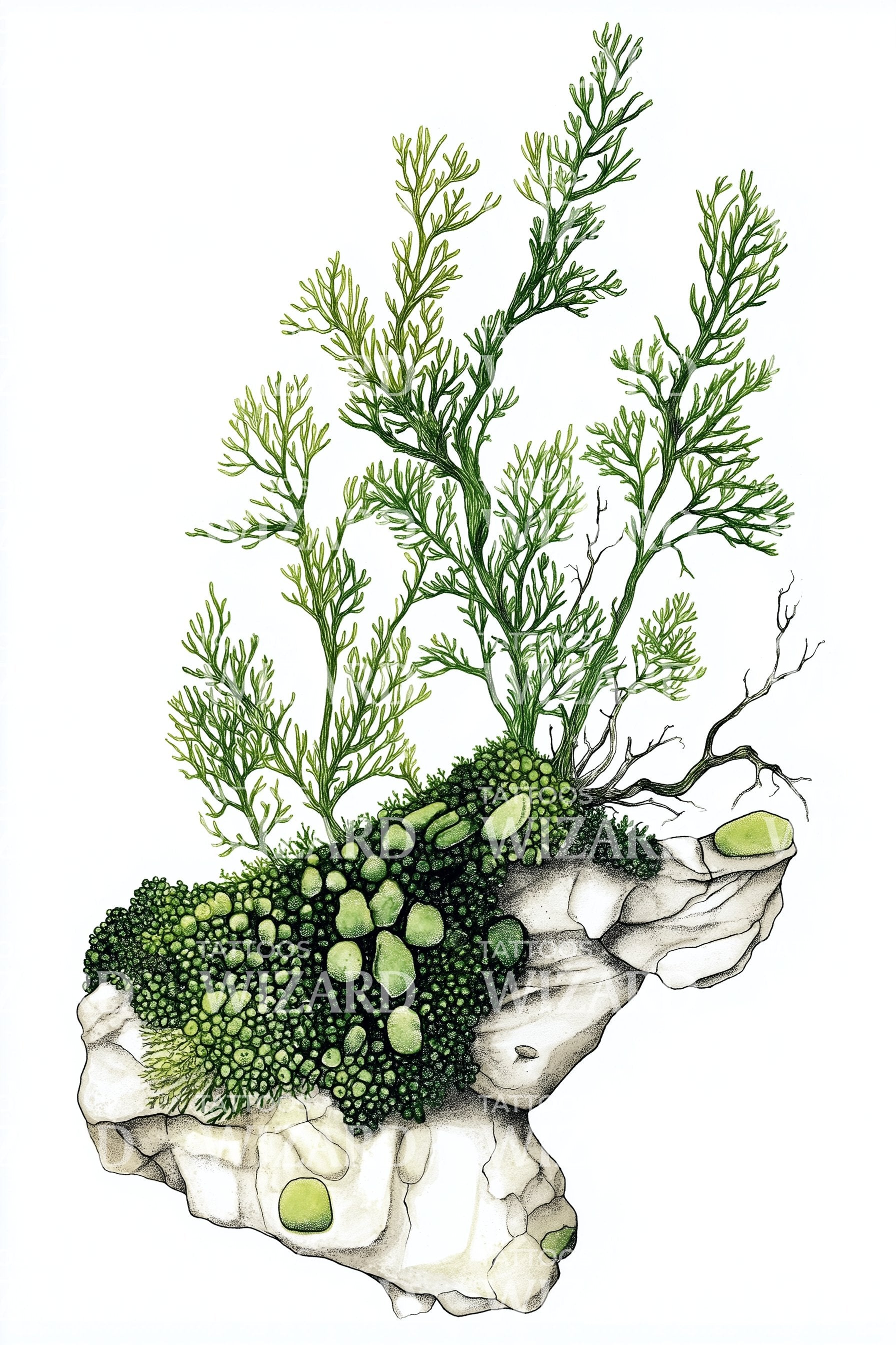For the ones who learned to root in motion, seaweed and algae become a botanical vow to the ocean: softness that survives. A rock holds the truth you claim, steady under pressure, alive in green. “Let the tide write its scripture through me.”