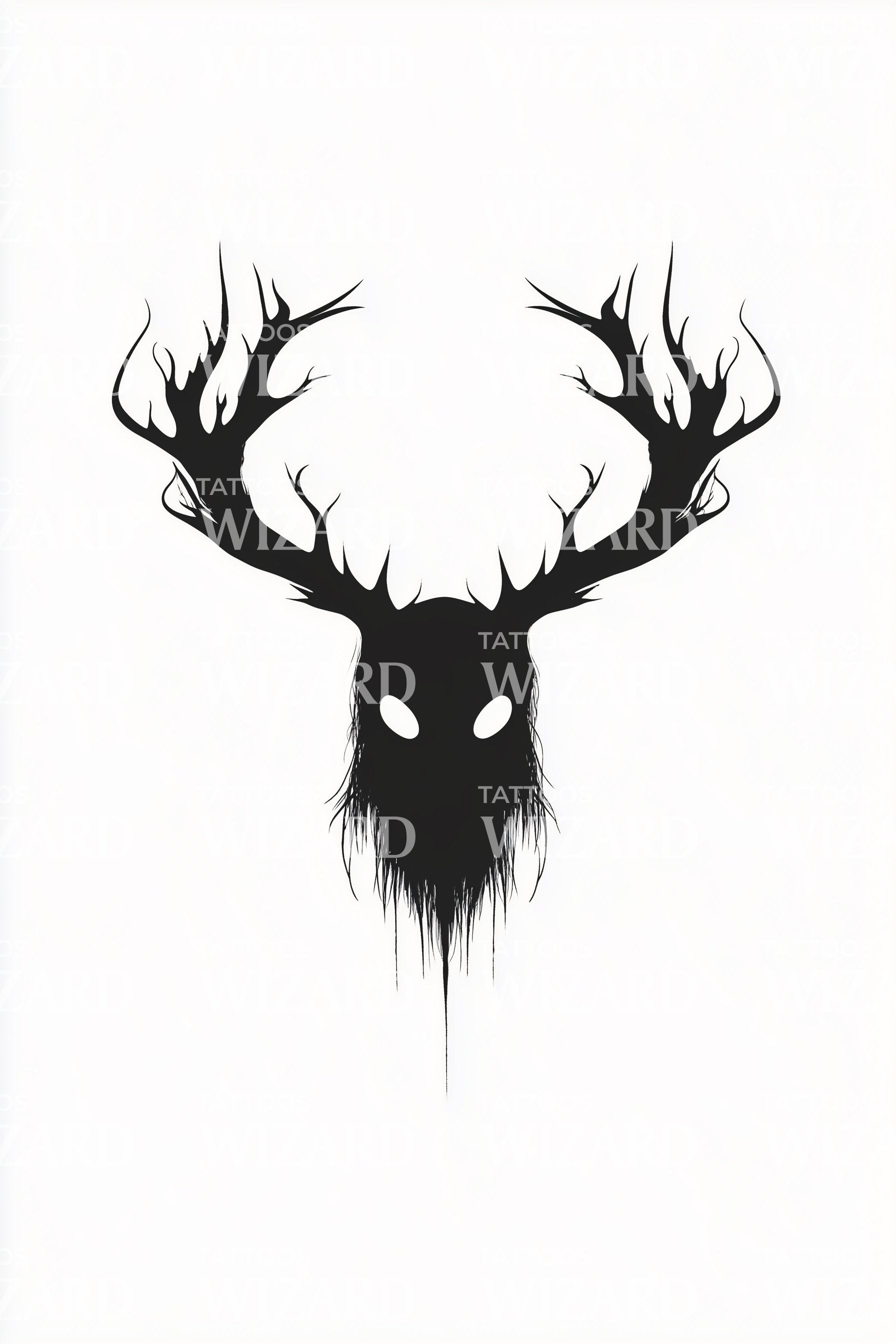 Blackwork silhouette of a forest spirit: ragged antlers branching like night trees, a dripping shadow mask with hollow eyes. Totemic and protective, it honors wild intuition and ancestral paths. Wearing it feels primal, steady, quietly fearless. Ideal placements: upper back, chest, sternum, or outer forearm for natural flow.