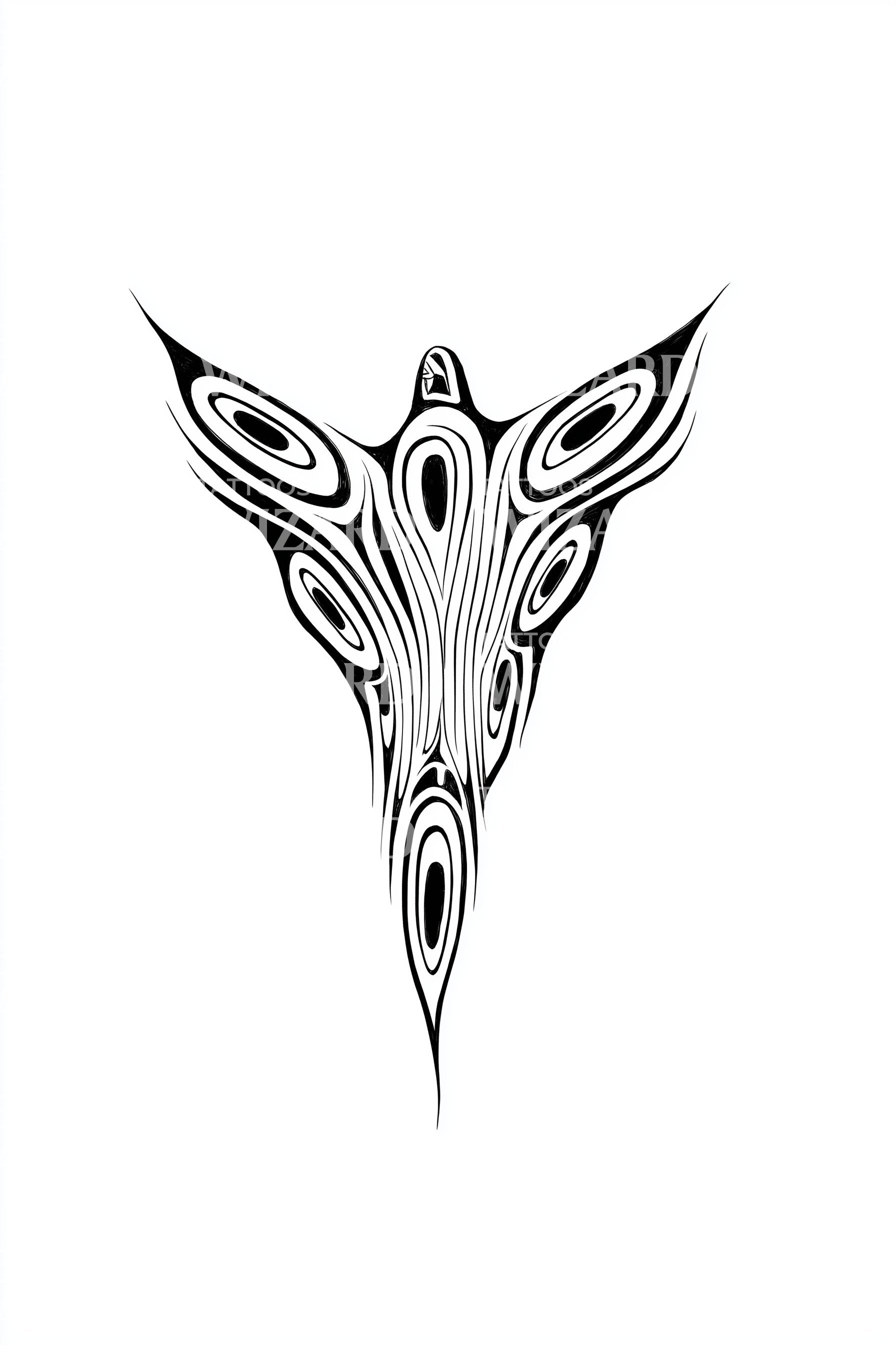 Liberta o teu espírito noturno com este desenho de tatuagem tribal de mariposa. Como um poderoso símbolo totémico, este design intricado funde a arte tribal com a beleza enigmática da mariposa. Perfeito para quem se sente atraído pela mística do mundo noturno, é uma tatuagem que revela a tua alma destemida.