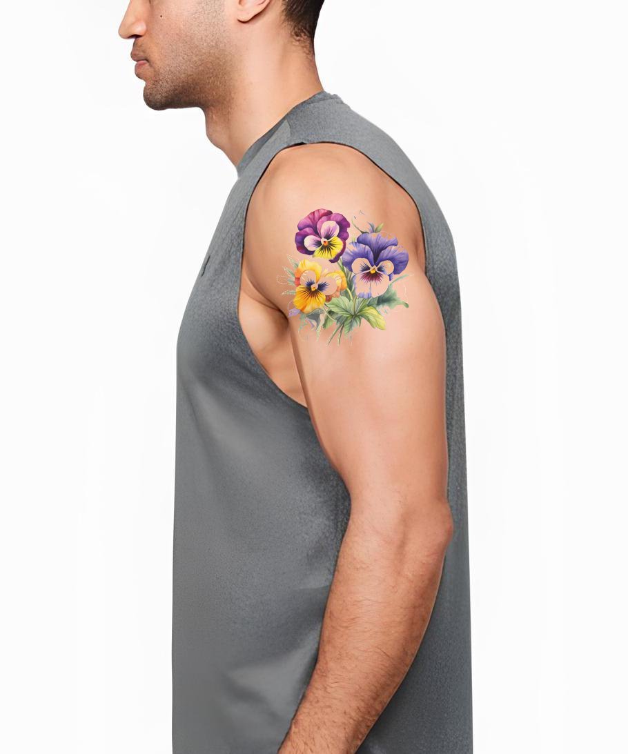 Mergulhe na paleta de cores vibrantes com o nosso design de Tatuagem de Pensamentos em Aquarela. Esta peça floral lindamente elaborada apresenta pensamentos vibrantes num arranjo em bouquet. É perfeita para amantes da natureza e da arte, combinando sem esforço a energia vivaz das aguarelas com o detalhe intricado das flores.