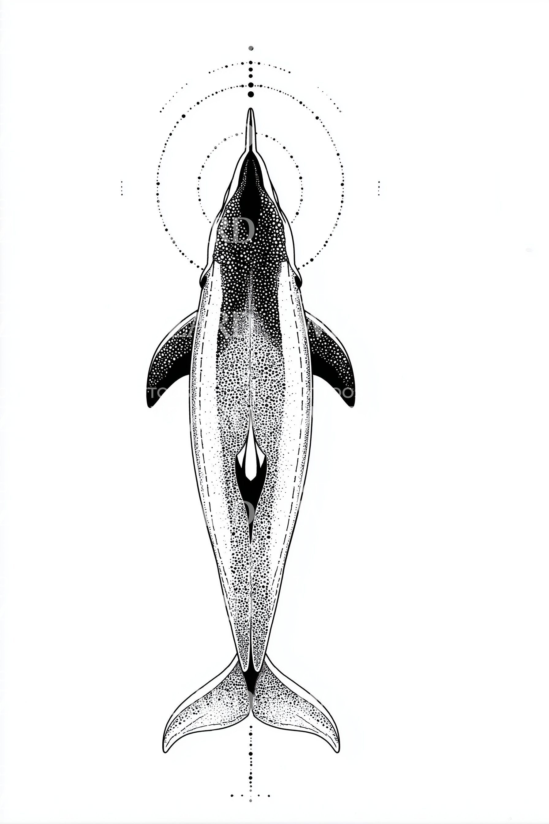 Fineline whale totem rises in a vertical ascent, stippled skin and clean outlines framed by orbiting dots and a central spine. Sacred geometry echoes sonar and breath. Symbol of ocean wisdom, protection, and grace, it invites stillness and depth, letting the wearer feel buoyant, guided, timeless.