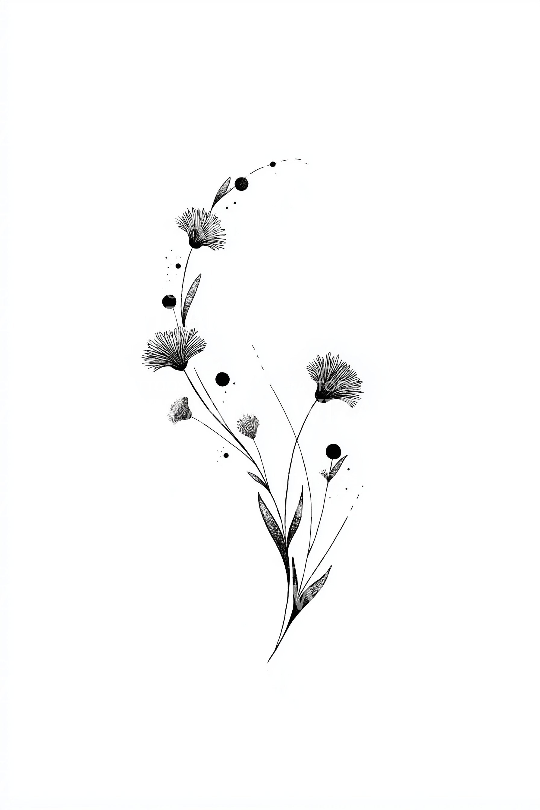 Experiencie a beleza encantadora da natureza no seu melhor, gravada a tinta preta. Este esboço de um ramo de flores silvestres irradia charme natural e arte. O design é despretensioso e simples, mas transmite uma conexão profunda com a natureza, tornando-o uma escolha perfeita para entusiastas da tatuagem.