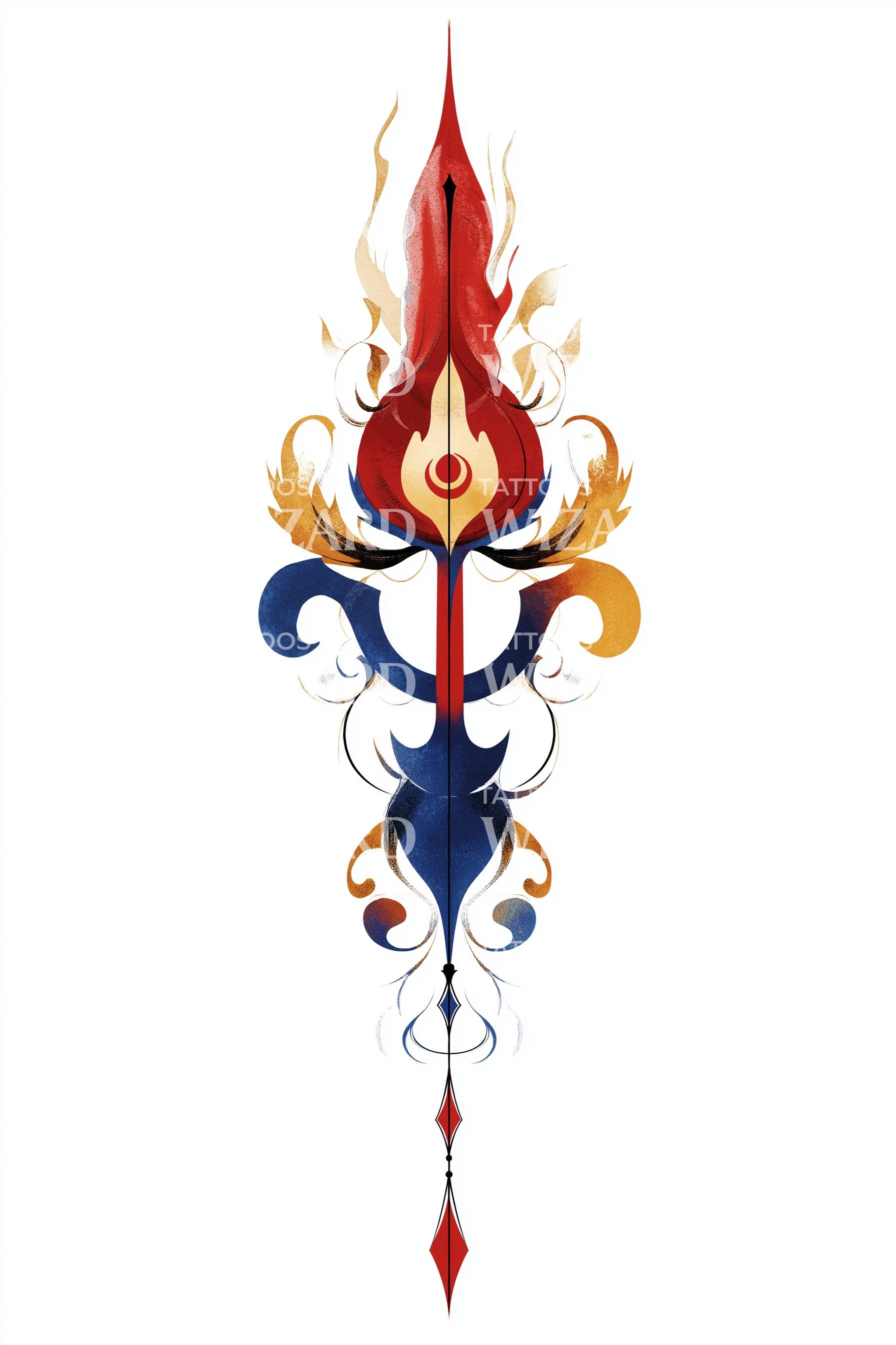 Incendeie a sua persona com os nossos designs ilustrativos de tatuagens. Este emblema apresenta uma fusão única de elementos solares e uma estética de chamas vermelhas ardentes, entrelaçada com uma iconografia alada intrincada. Acentos em azul profundo adicionam um toque de mistério. Faça uma declaração solar com esta peça hipnotizante de arte corporal.