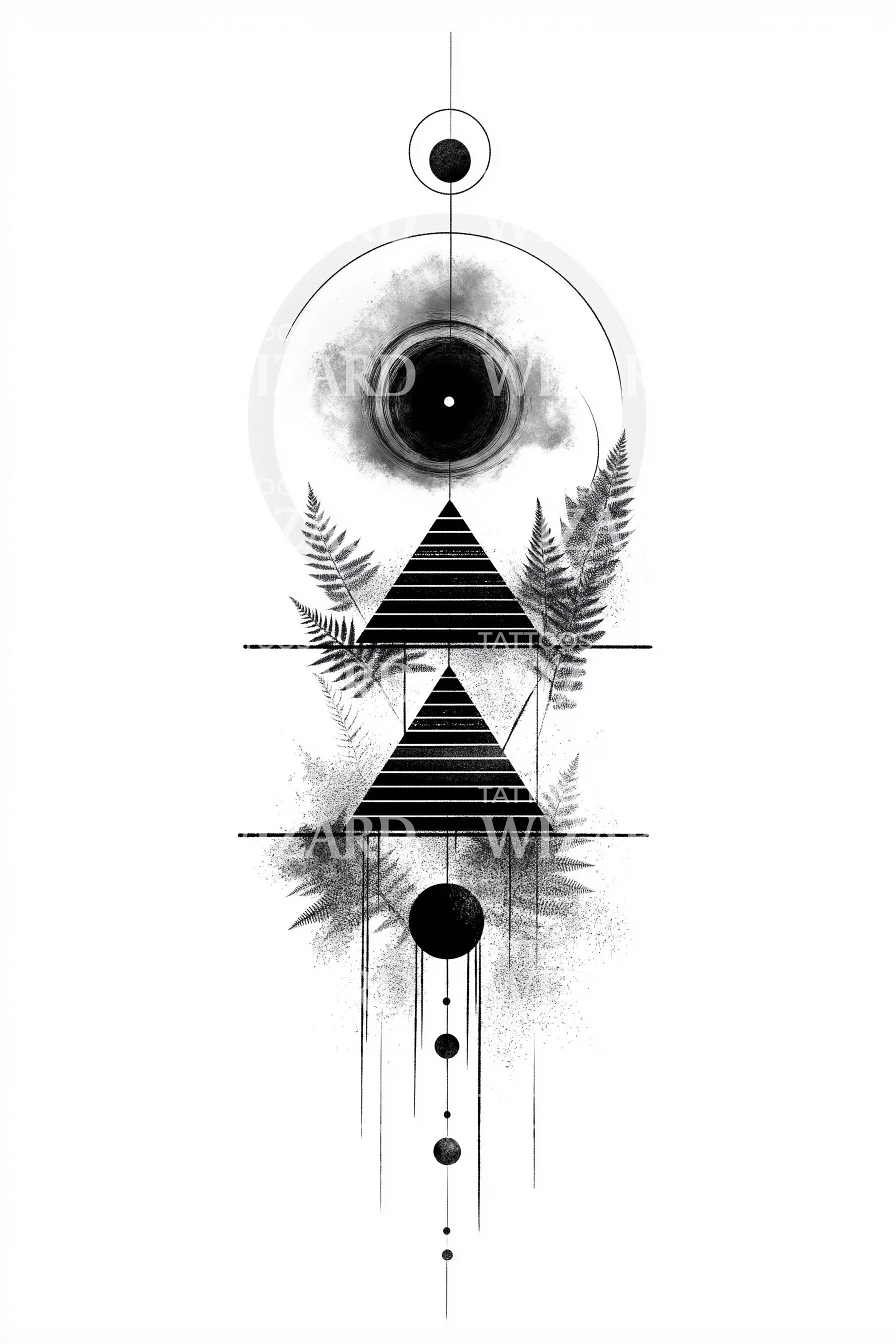 Mergulhe no misticismo com este requintado desenho de tatuagem Dotwork. Infundido com elementos geométricos, este design apresenta uma asa detalhada, um triângulo intricado e uma pirâmide perfeitamente simétrica, todos envoltos por um eclipse hipnotizante. Uma encarnação única de mistério e geometria em harmonia.