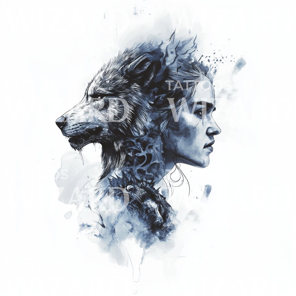 Design de Tatuagem Fusão Mulher e Lobo