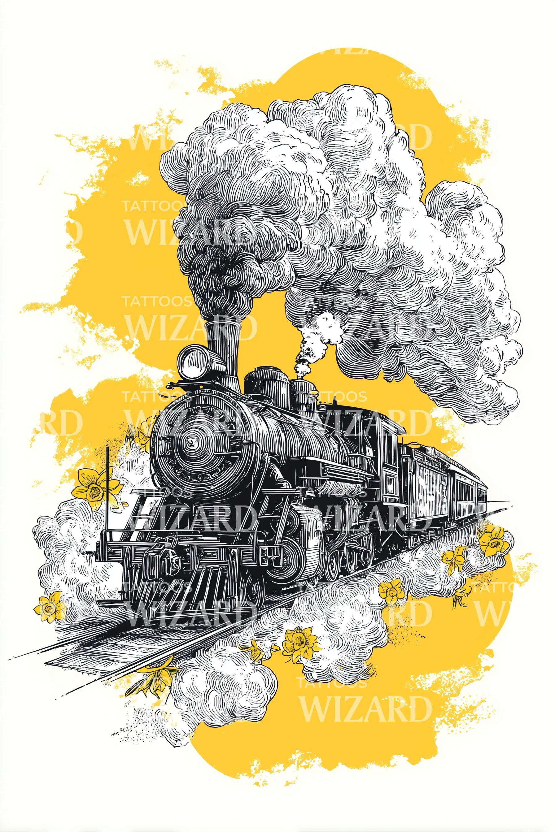 Desenho de Tatuagem de Locomotiva com Salpicos Amarelos