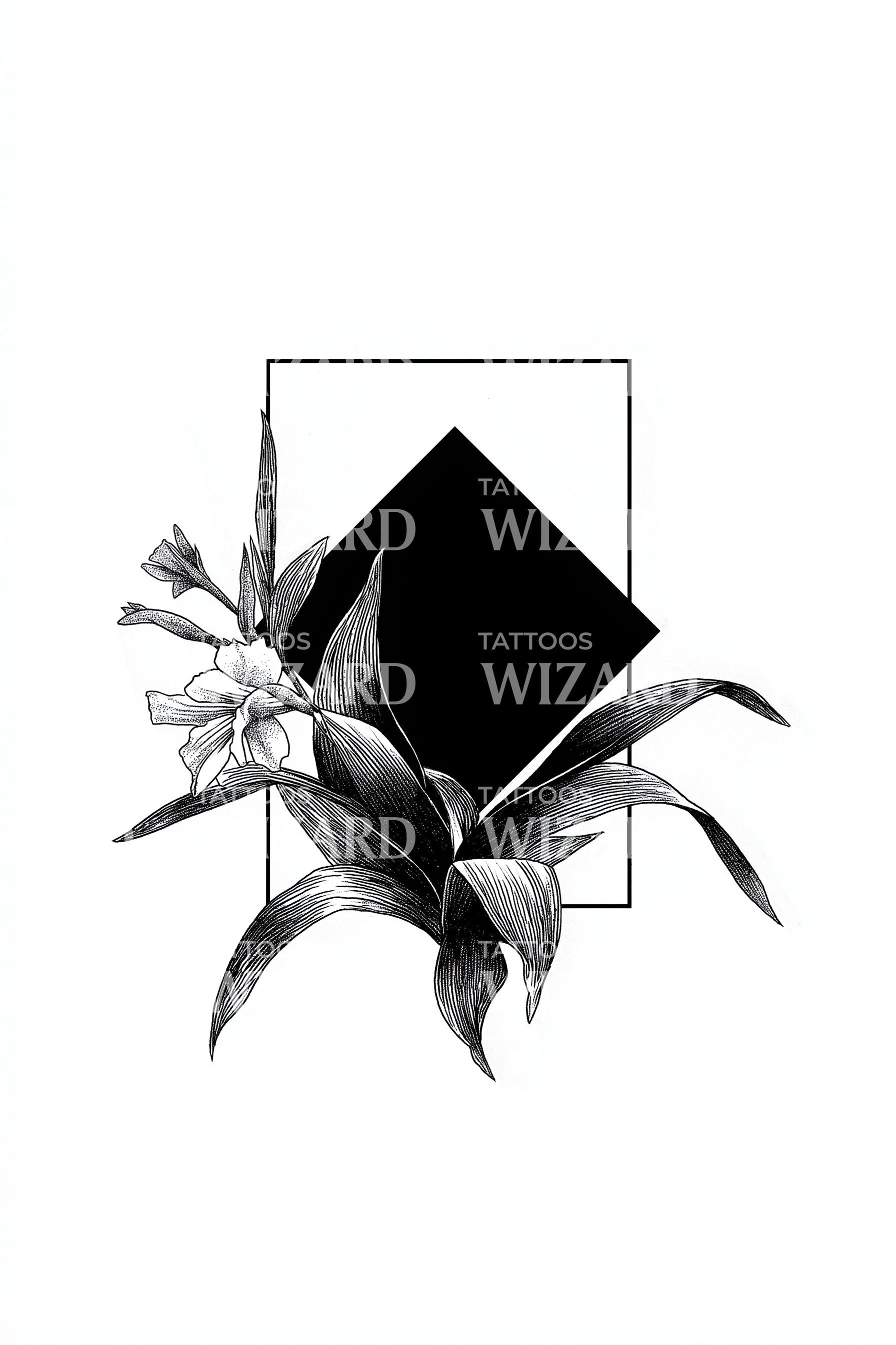 Тщательно выполненный с точностью, этот минималистичный тонкий тату-дизайн демонстрирует изысканный цветок в рамке. Его сдержанность подчеркивает красоту сложных деталей, символизируя грацию и изящество. Идеально подходит для тех, кто ищет легкий, элегантный акцент в своей коллекции татуировок.