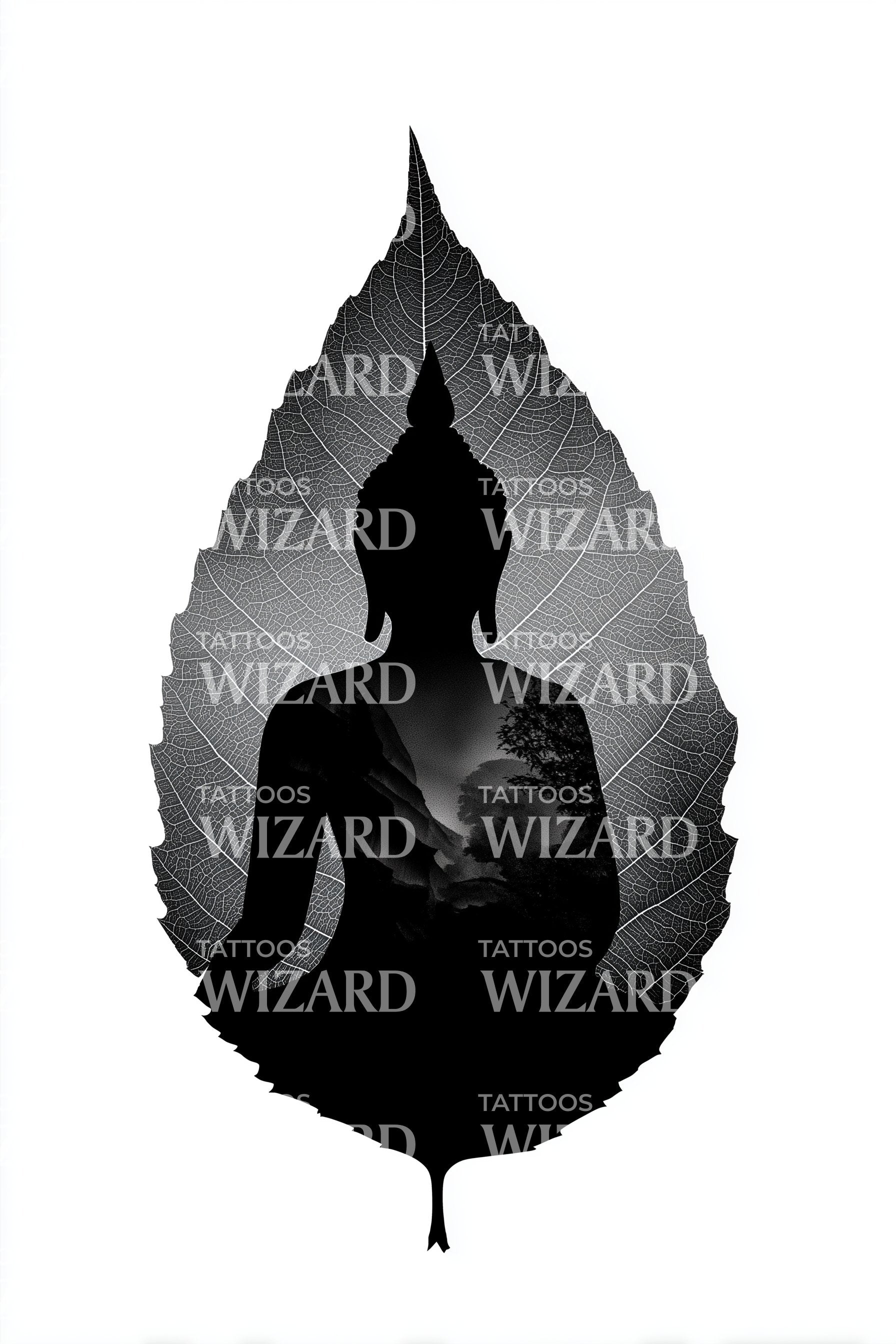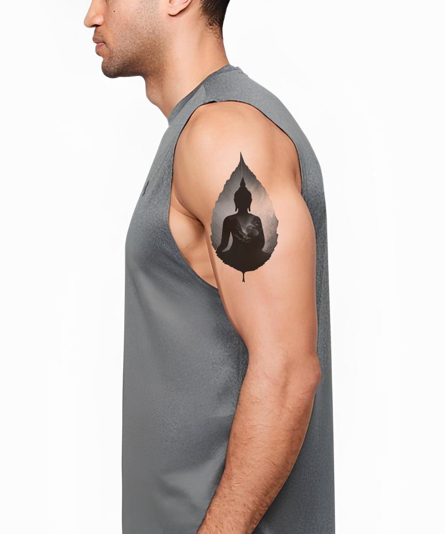Погрузитесь в спокойствие с этим сияющим тату в стиле blackwork с изображением Будды. Мастерски выполненный, он представляет собой спокойный силуэт Будды в медитации, окружённый символическими листьями. Это интимное выражение просветления идеально подходит для тех, кто стремится к постоянной осознанности.