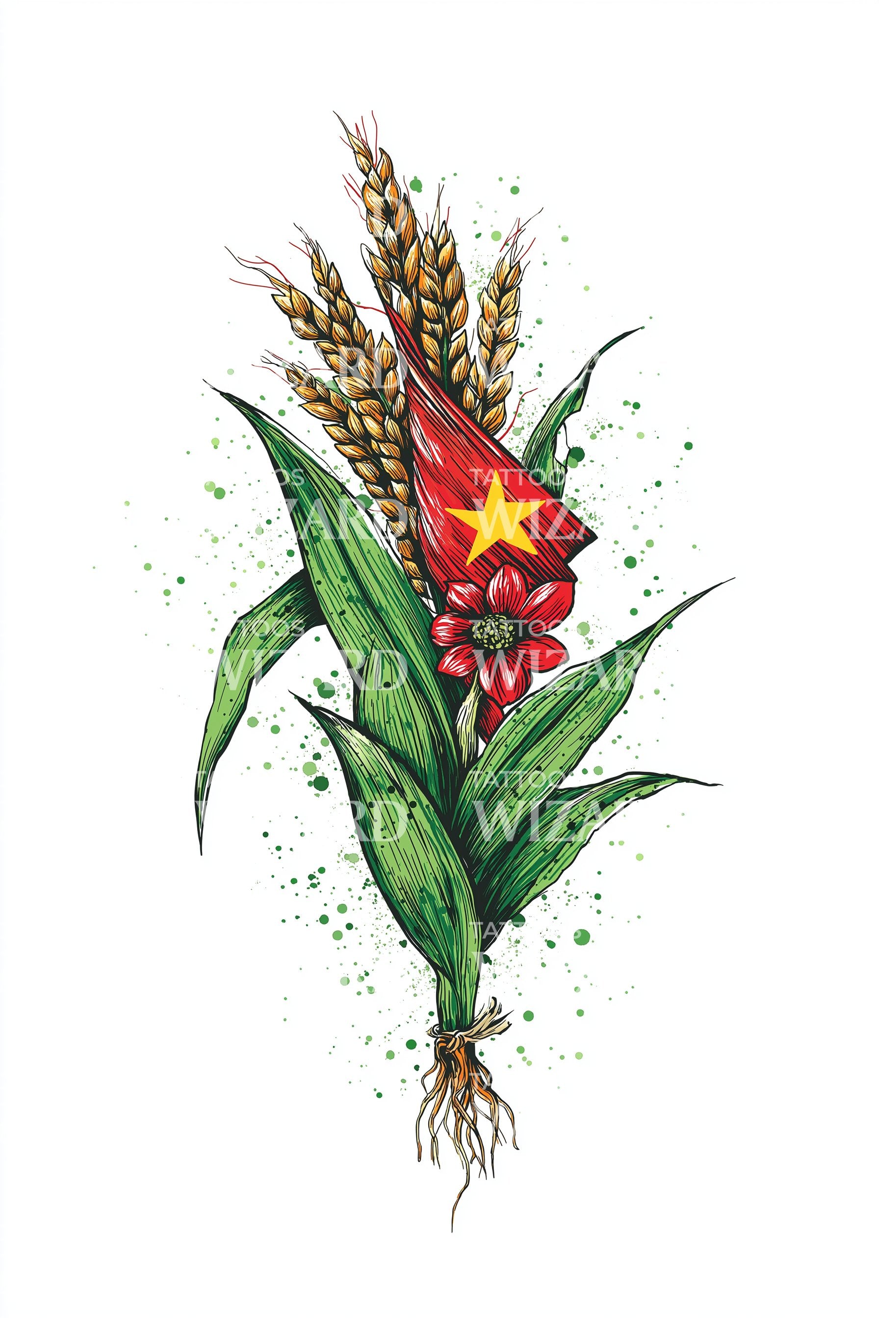 Отпразднуйте живой дух Камеруна с этим цветочным тату-дизайном, где изящные стебли кукурузы изгибаются в пышные зелёные листья и яркий красный цветок. Центральная звезда отсылает к наследию и сельскому хозяйству, сочетая органичную грацию с культурной гордостью — идеально для любителей природы, земледельцев, коллекционеров ярких акцентов и фермеров.