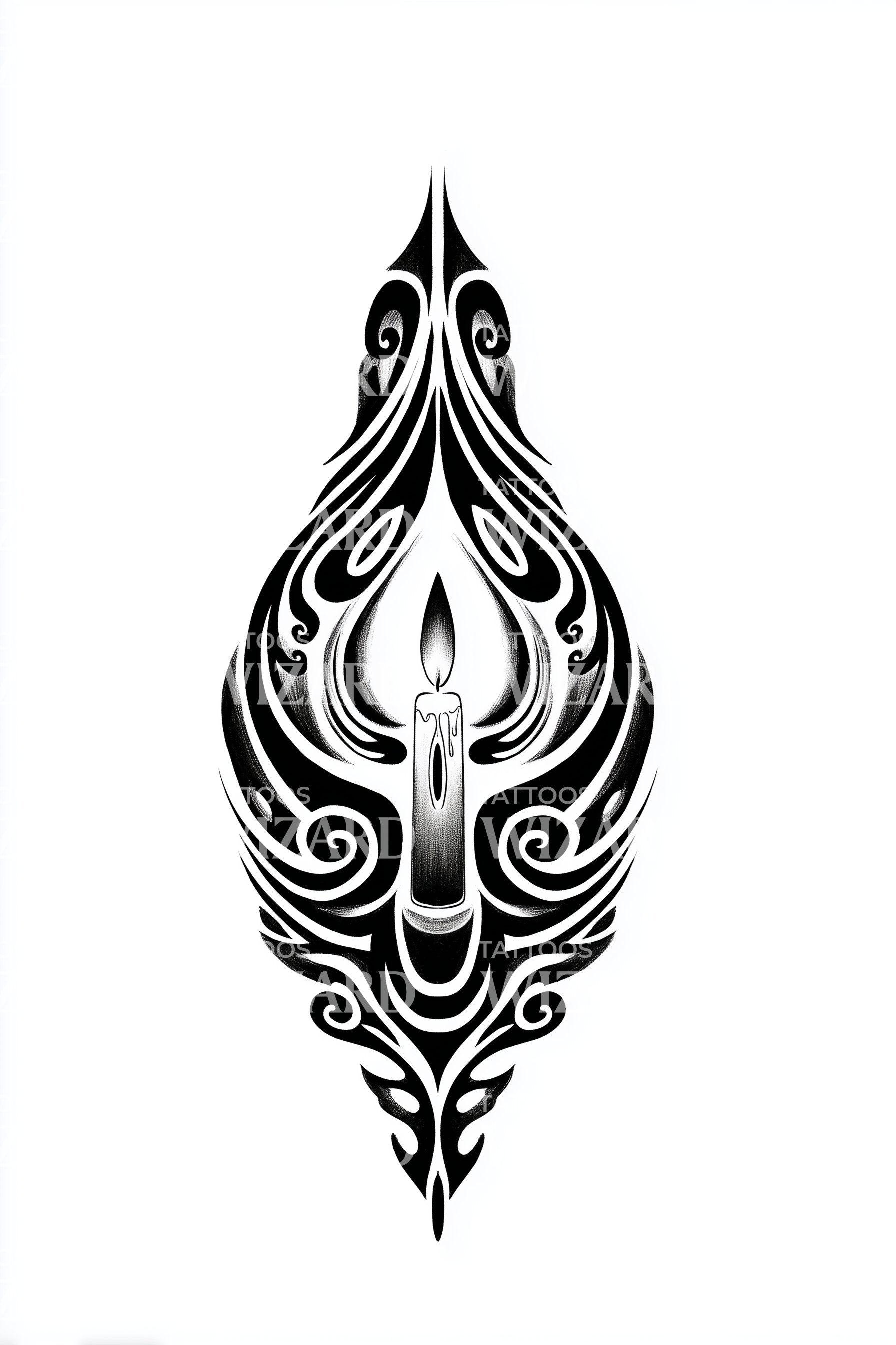 Погрузитесь в богатую символику этого татуировки в стиле трайбл. Излучая священную и древнюю атмосферу, свеча в его центре символизирует охранное пламя — эмблему защиты и просветления. Замысловатые орнаментальные узоры изящно сочетают традиционные трайбл-элементы, создавая мощное, священное произведение искусства на теле.