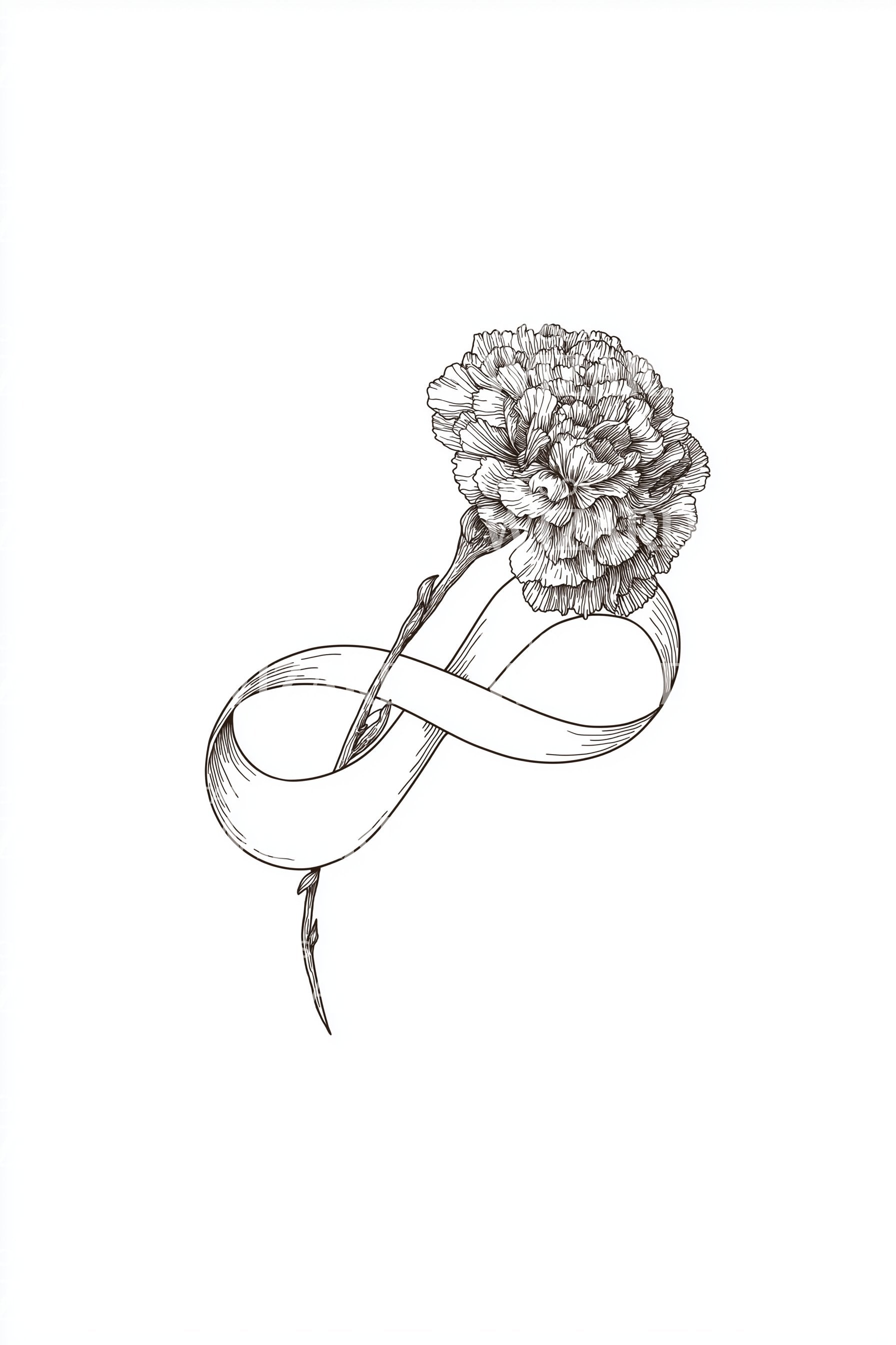 Погрузитесь в изысканный баланс простоты и элегантности с нашим тонким тату дизайном гвоздики. Прекрасно нежный, дизайн плавно переходит в минималистичное изображение бесконечности. Гвоздика, одновременно очаровательная и стойкая, придаёт этой работе глубокий смысл. Идеально подходит для сдержанного, но выразительного акцента.