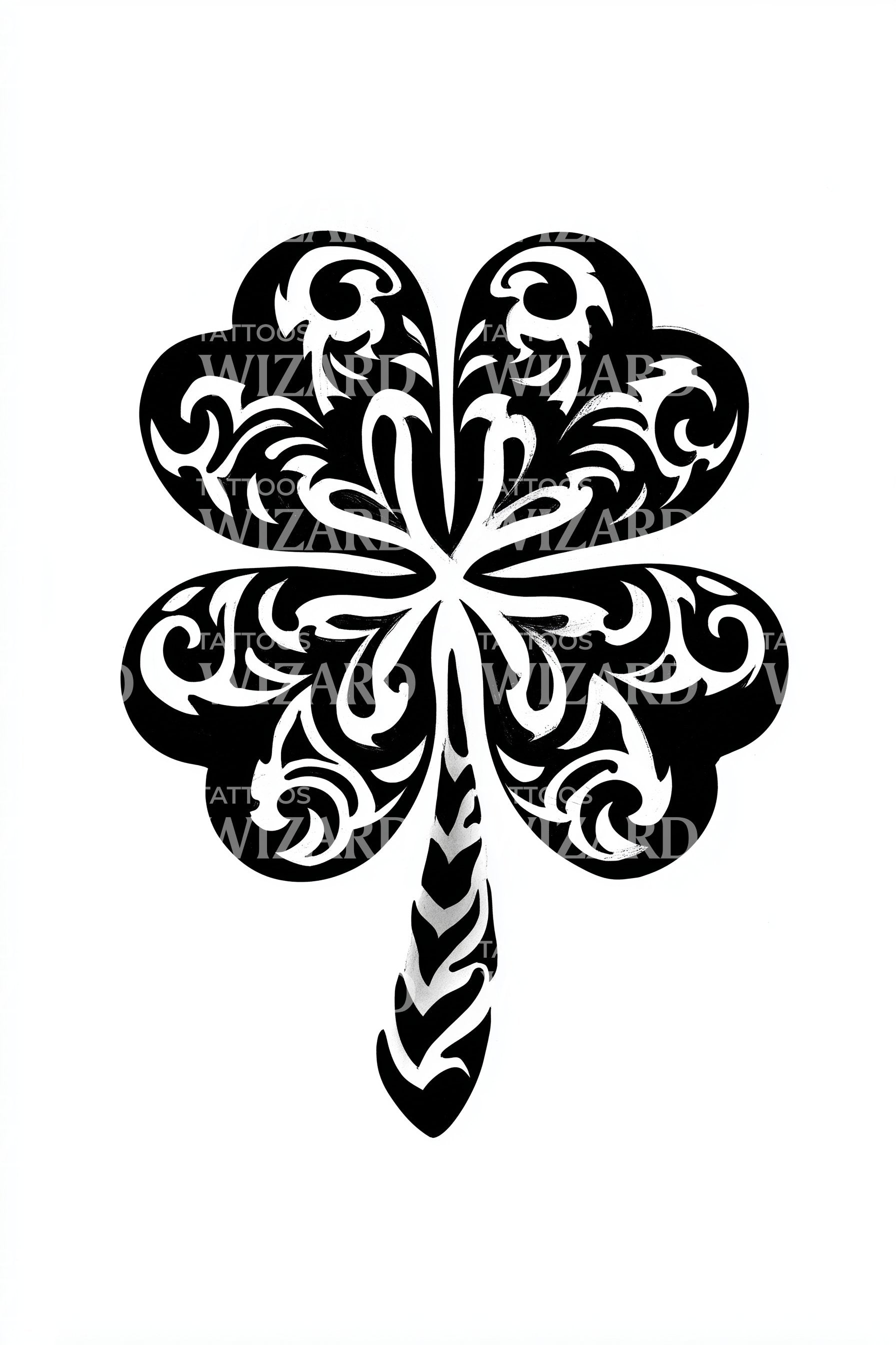 Освободите силу клевера с этим племенным ирландским тату-дизайном. Излучая силу и удачу, эта работа украшена ярким клевером в центре, окружённым элементами племенного герба. Идеально подходит для тех, кто хочет почтить своё наследие, нося удачу на своей коже.