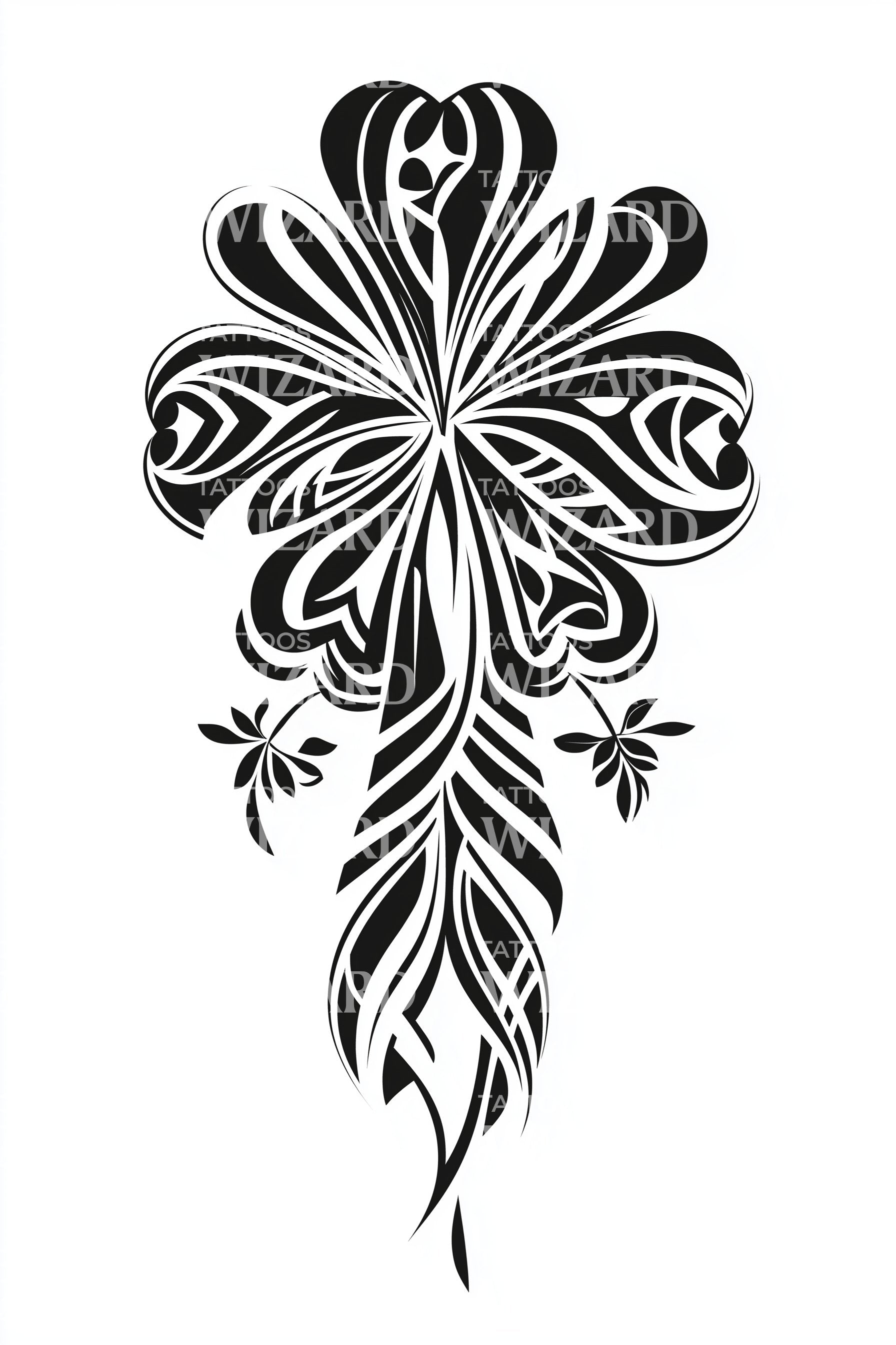 Погрузитесь в богатую ирландскую культуру с этим тату-дизайном в стиле племени. Наполненный символическими элементами, такими как счастливые клеверы и нежные перья, он воплощает плавный племенной мотив. Это экзотическое произведение искусства — не просто дизайн; это выражение наследия, удачи и стойкого духа племени.