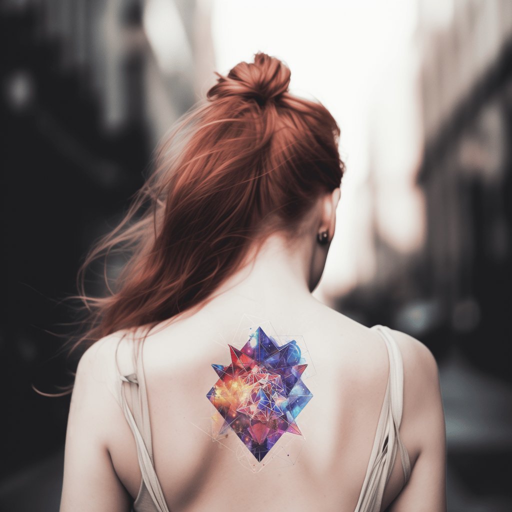 Погрузитесь в загадку вселенной с этим геометрическим тату-дизайном. Наполненный космическими оттенками, он воплощает мистический космос и геометрическое чудо в удивительном слиянии. Идеально подходит для тех, кто ищет духовность и выразительный цвет, это тату приносит частичку небесного пространства на вашу кожу.