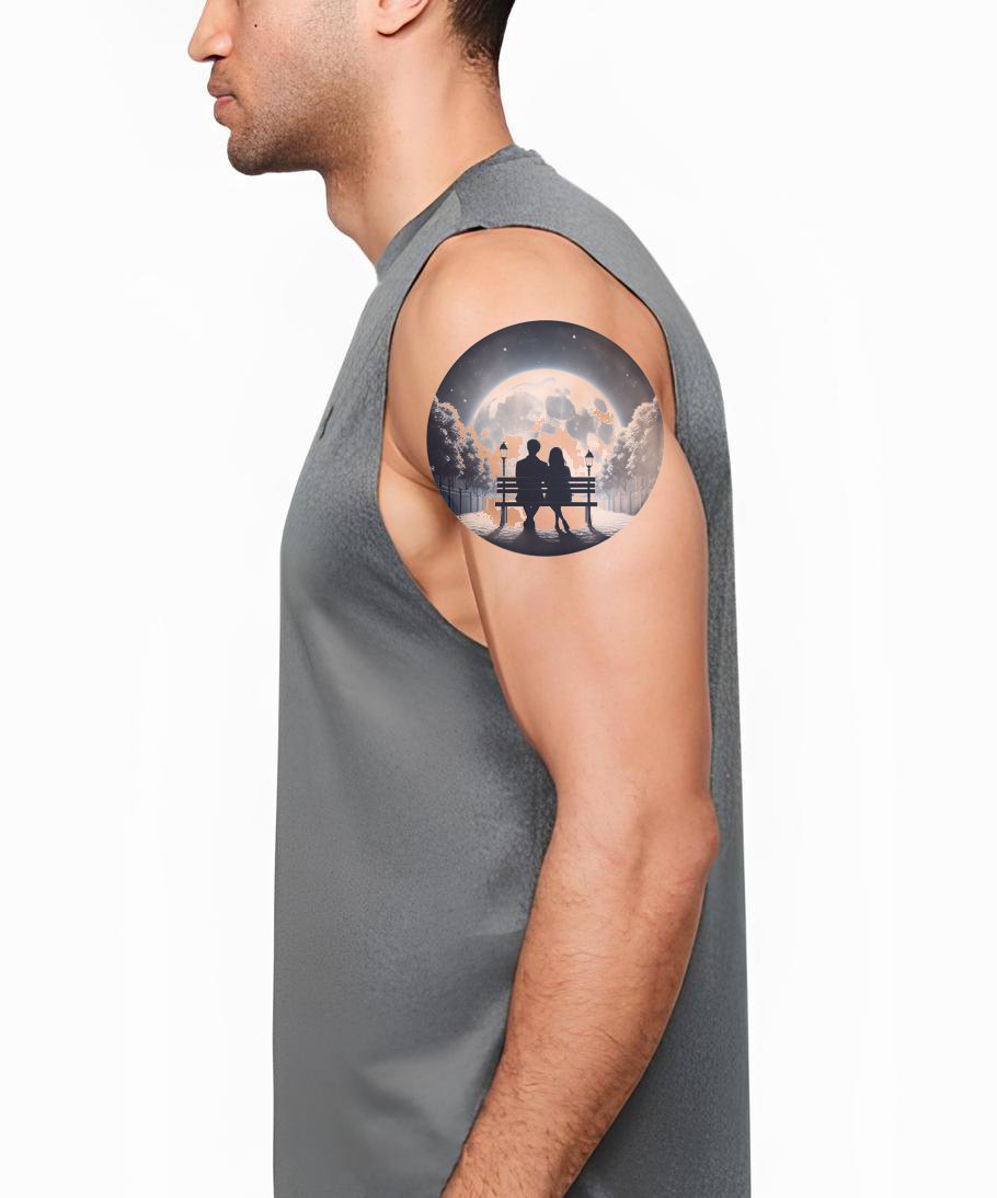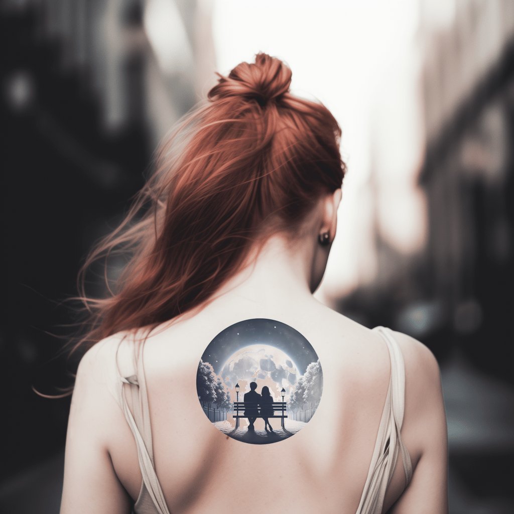 Этот очаровательно нежный дизайн татуировки изображает причудливую любовную историю, разворачивающуюся под лунным светом в спокойном парке. Идеально подходит как для романтиков, так и для любителей; этот дизайн несёт в себе очарование, символизирующее вечную любовь и нежность под умиротворяющим взглядом луны.