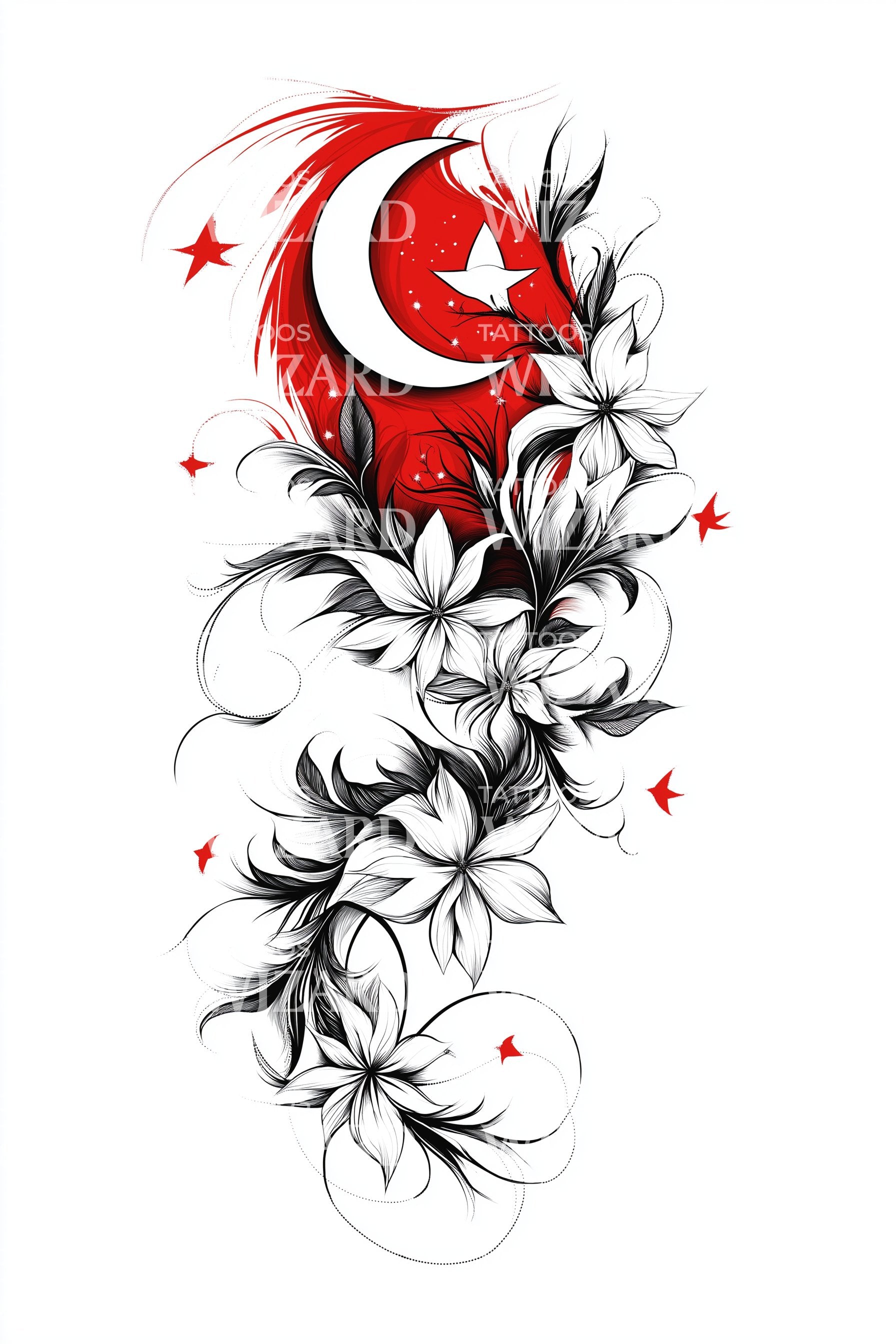 Выразительный акварельный дизайн татуировки в ярко-красных тонах, сочетающий абстрактные разводы с изящным полумесяцем и разбросанными звёздами. Плавные завитки вызывают ощущение движения и гордости, отдавая дань духу Турции. Мягкие края, многослойная прозрачность и воздушное негативное пространство создают светящийся, современный символ, который ощущается личным и вечным.