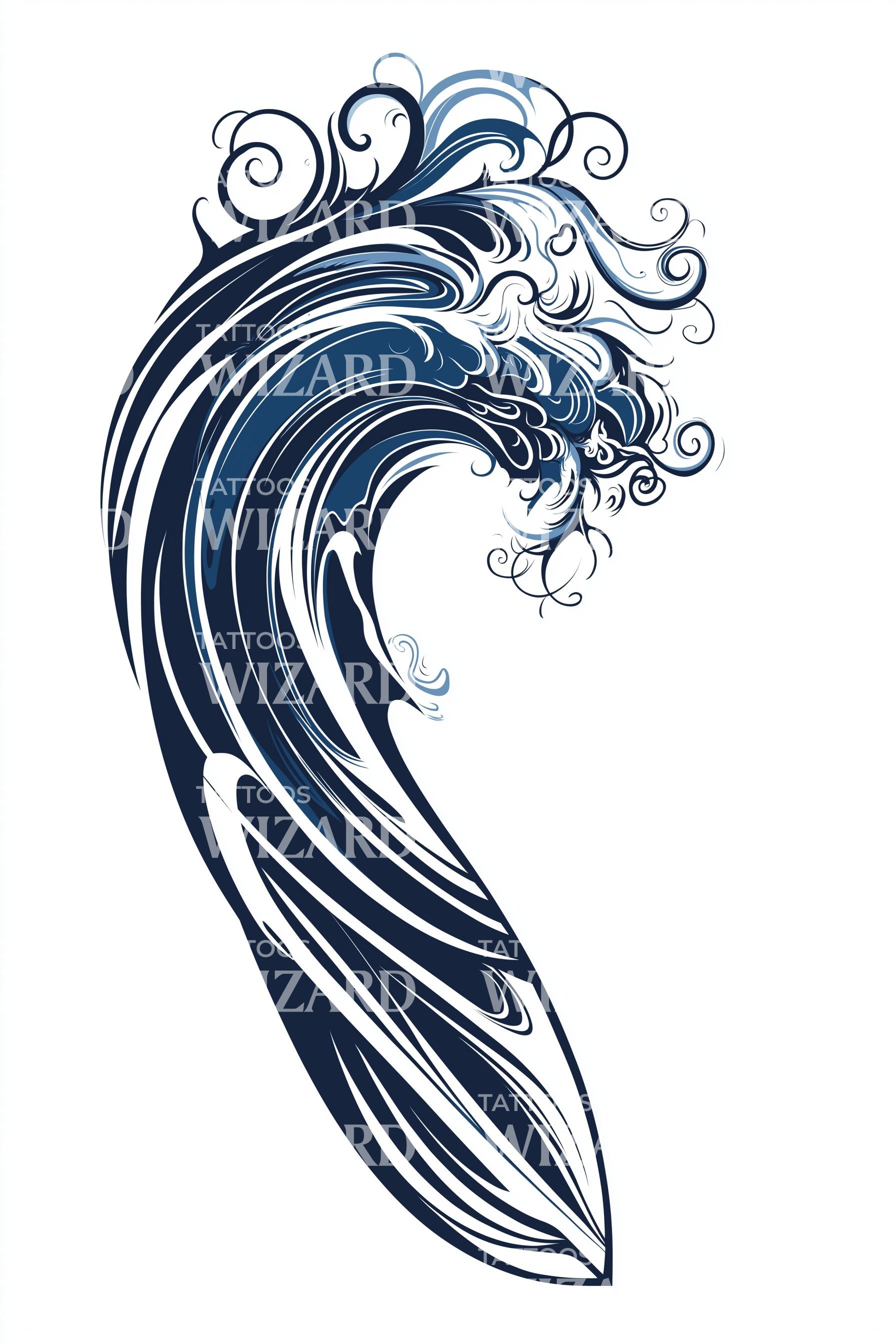 Sculpted swells coil into a deep-blue cresting wave, an illustrative sea emblem where lines ripple like lacquered tides. Symbolizing renewal, resilience, and momentum, the curve carries calm power and freedom. Ideal placements: forearm or calf to follow flow; ribcage or shoulder blade to arc gracefully, logo-clear and bold.