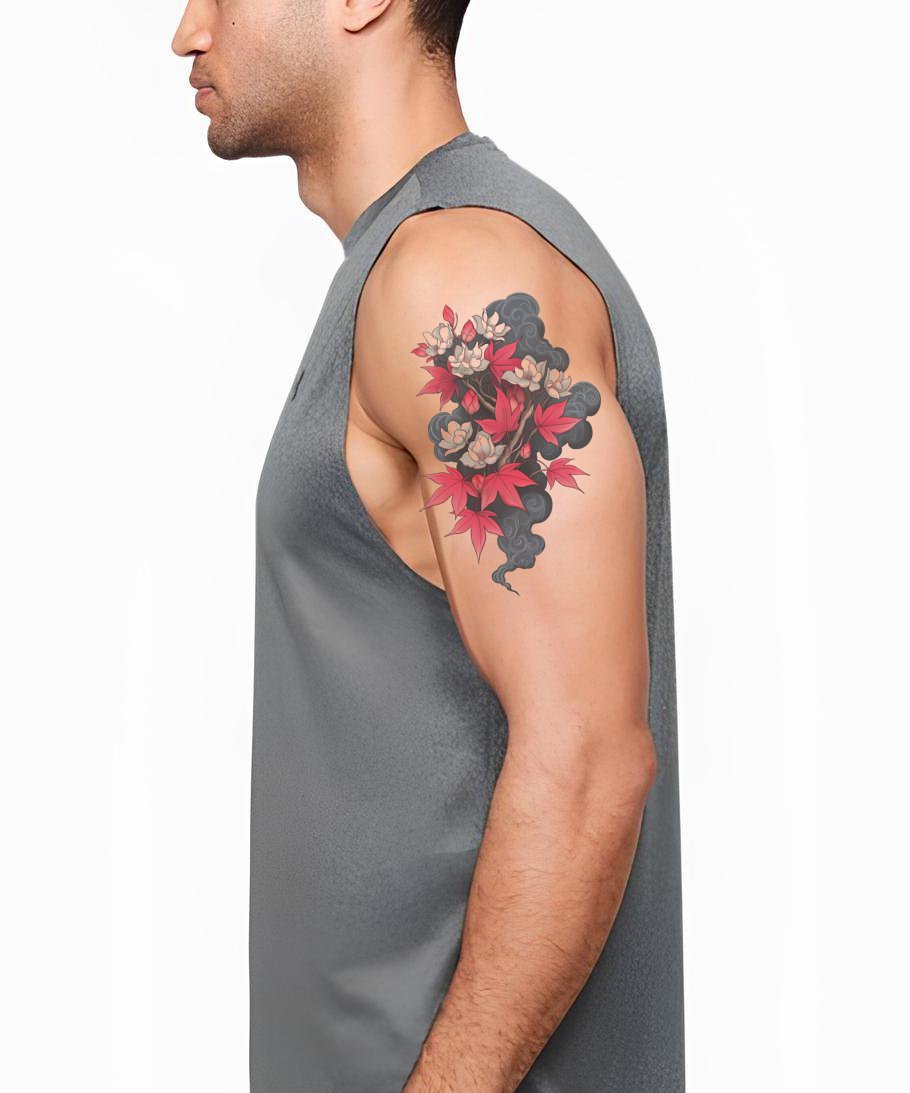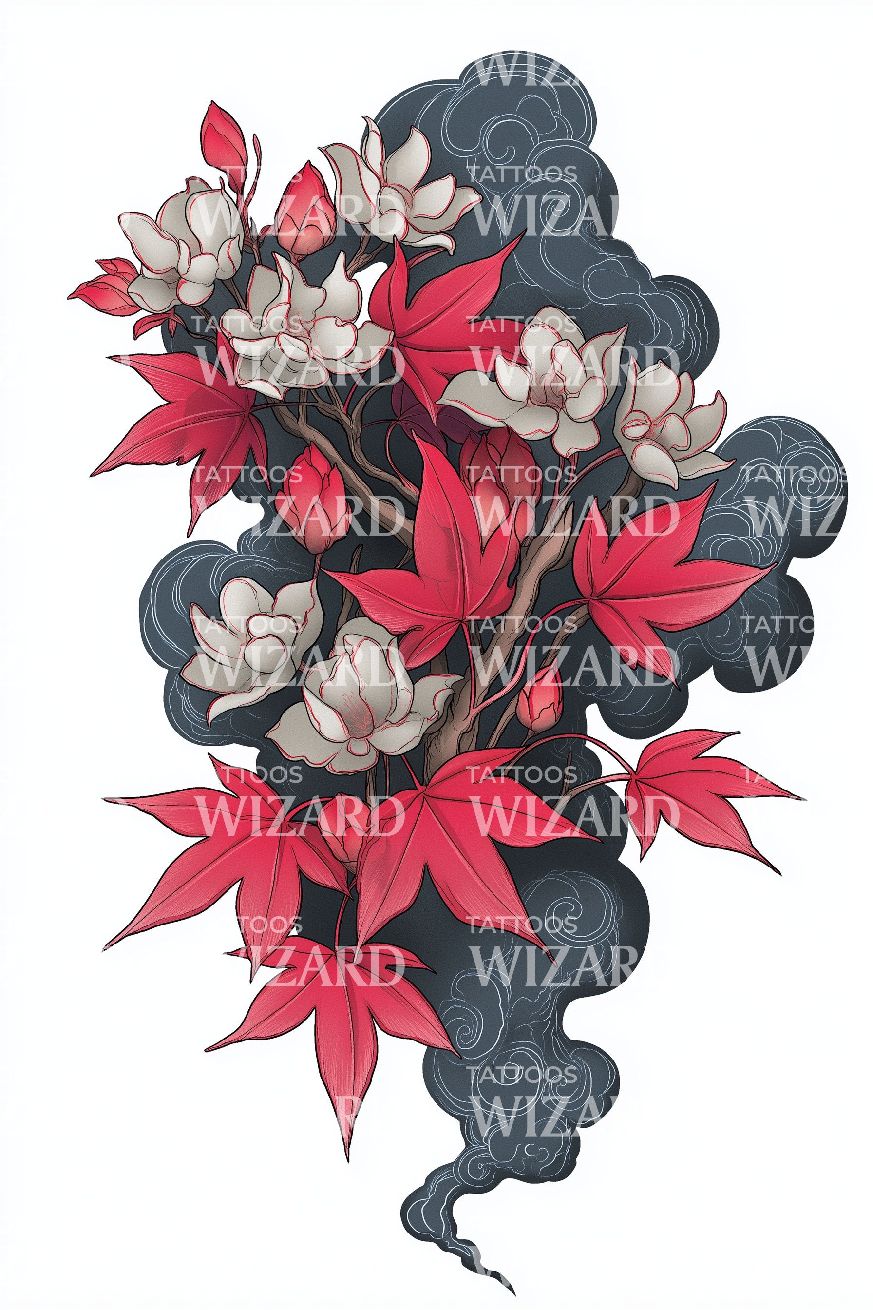 Погрузитесь в красоту осени с этим изящным дизайном татуировки, в котором сочетаются пышные красные кленовые листья и плавный цветочный узор. Уникальные дымчатые эффекты придают волшебное настроение. Идеально для тех, кто ищет гармонию природного очарования и художественного самовыражения.