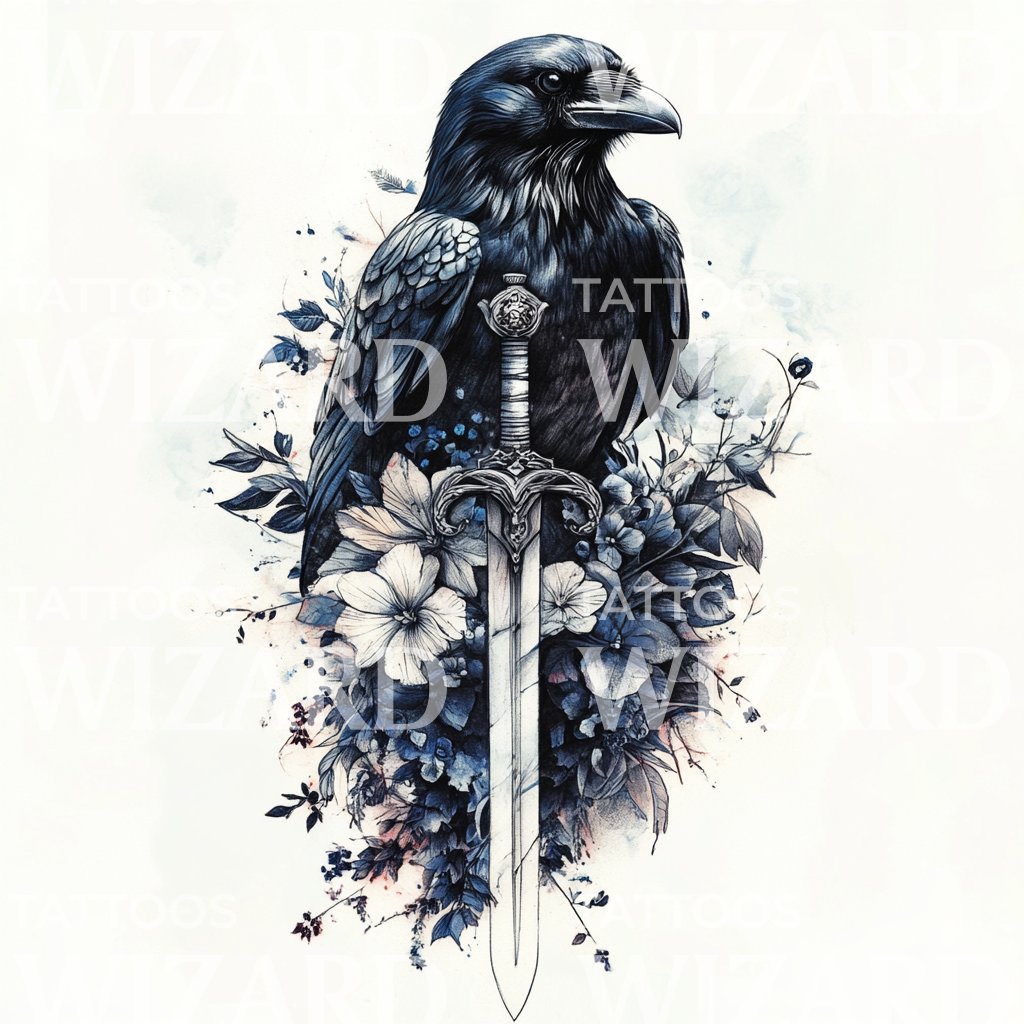 Величественный ворон, сидящий на мече, дизайн татуировки