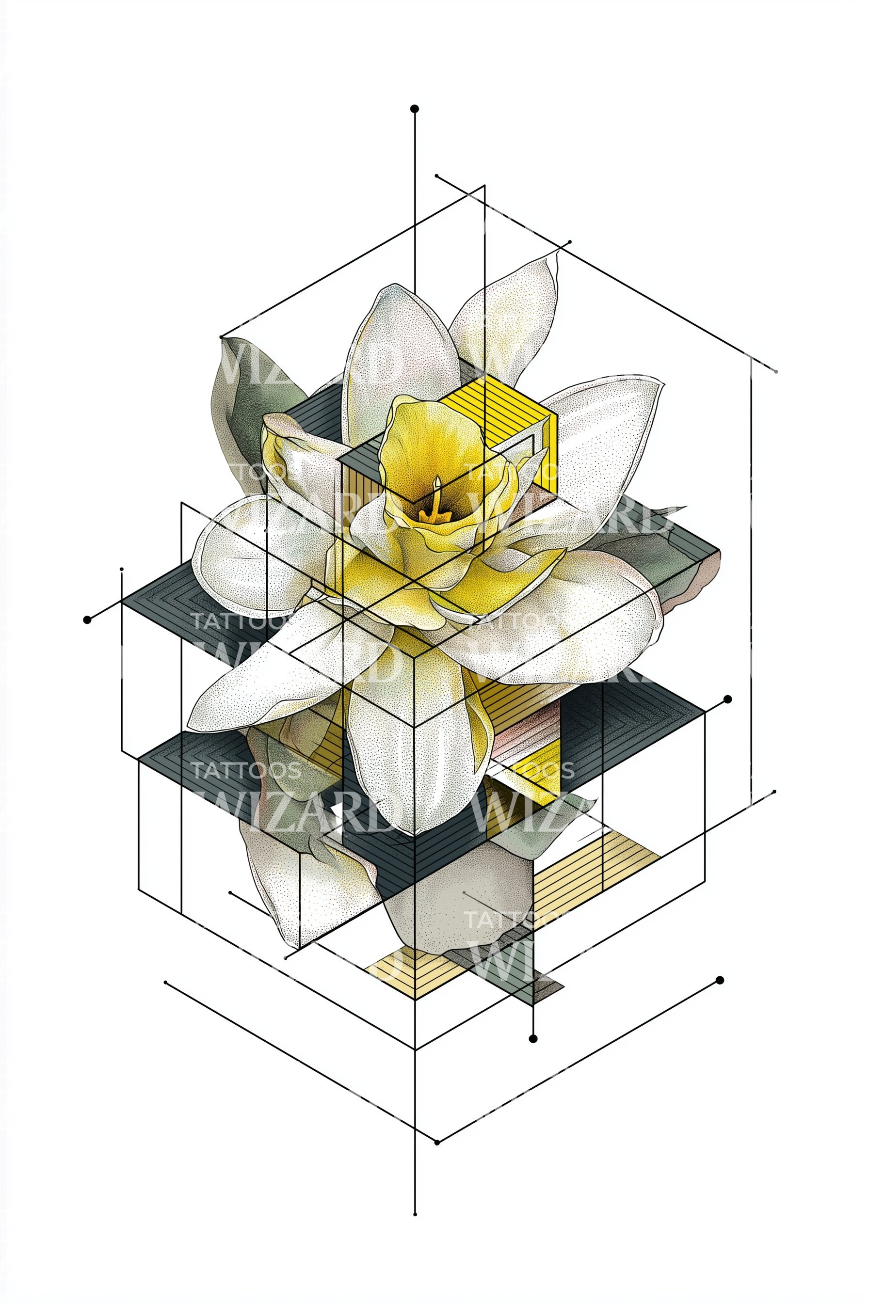 Этот современный геометрический дизайн татуировки с использованием изометрических техник предлагает уникальную кубическую форму, наполненную яркими жёлтыми нарциссами. Сочетая традиционную иконографию с современным дизайном, он воплощает уникальное слияние природного и абстрактного мира. Художественное выражение для смелой индивидуалистической души.