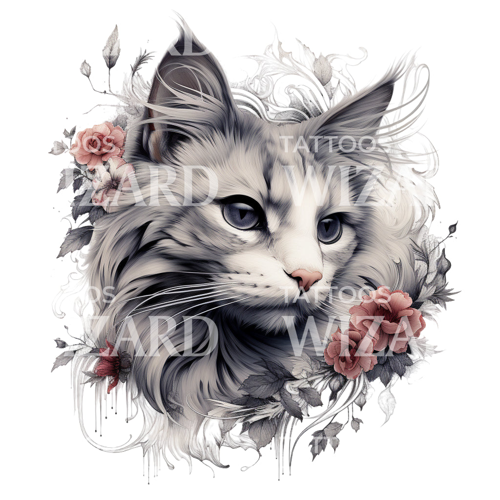 Погрузитесь в очарование этого милого тату с изображением котёнка. Выполненное в изящных чёрно-серых тонах, оно прекрасно подчёркивает игривый дух этого пушистого создания среди замысловатых цветочных узоров. Эта иллюстрация идеально подойдёт любому любителю животных, который ищет татуировку, сочетающую в себе милоту и стиль.