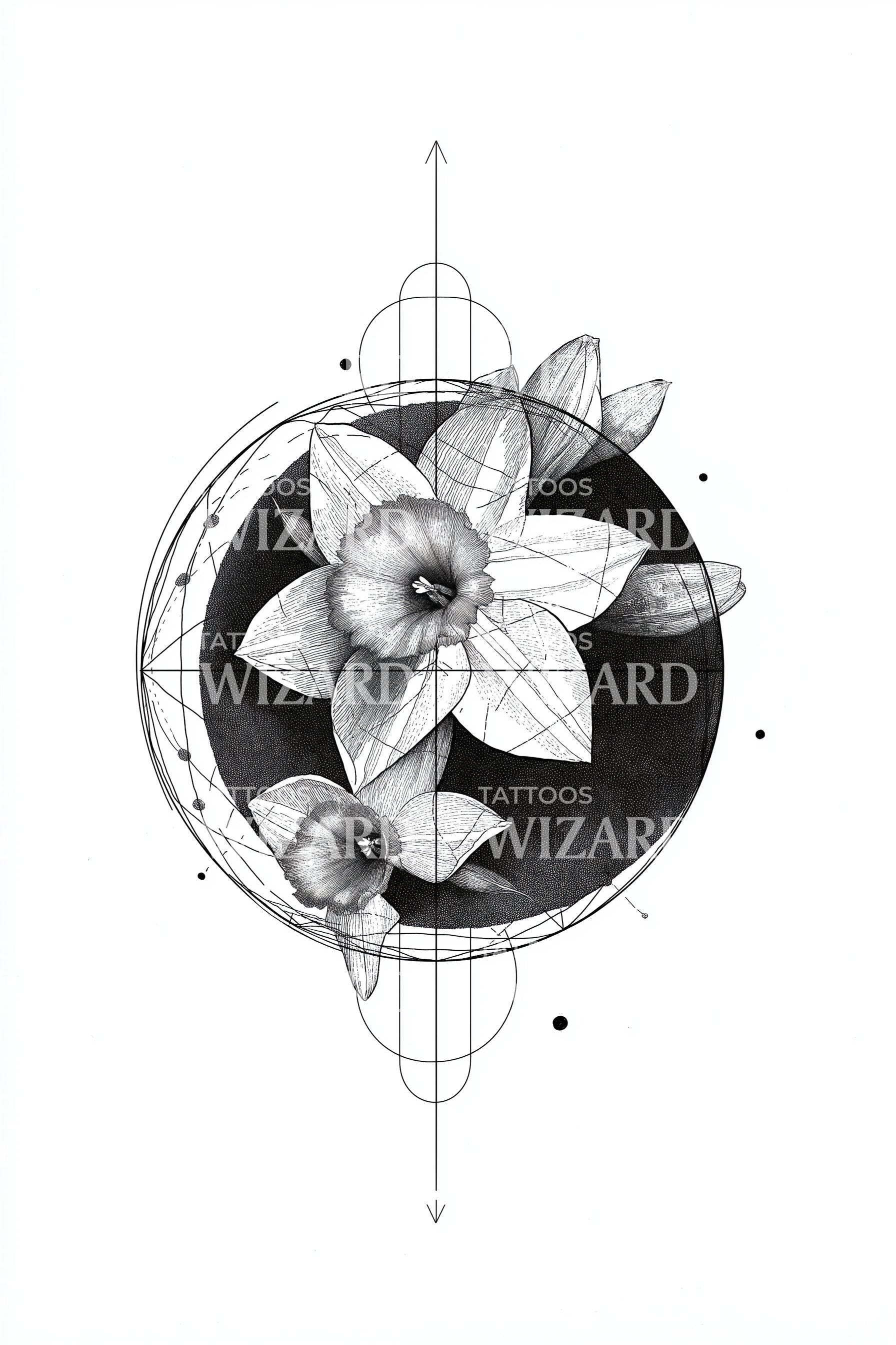 Погрузитесь в небесное очарование с этим уникальным тату-дизайном в технике дотворк. Он великолепно сочетает изящный цветок нарцисса с спокойной орбитой космоса. Идеально подходит для тех, кто очарован вселенной и красотой природы, этот дизайн передаёт магию, скрытую в космосе и скромном нарциссе.