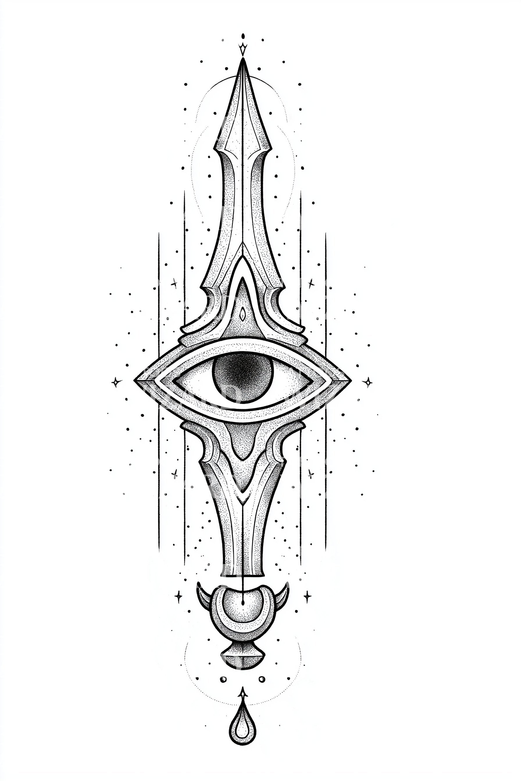 Погрузитесь в символизм с этим священным тату-дизайном в стиле blackwork, сочетающим чёткую геометрию и мистические элементы. Пронизывающий глаз, кинжал и мощный столп выделяются смело, выполнены с тонкой детализацией. Идеальный выбор для тех, кто ценит художественное выражение стойкости и духовной защиты.