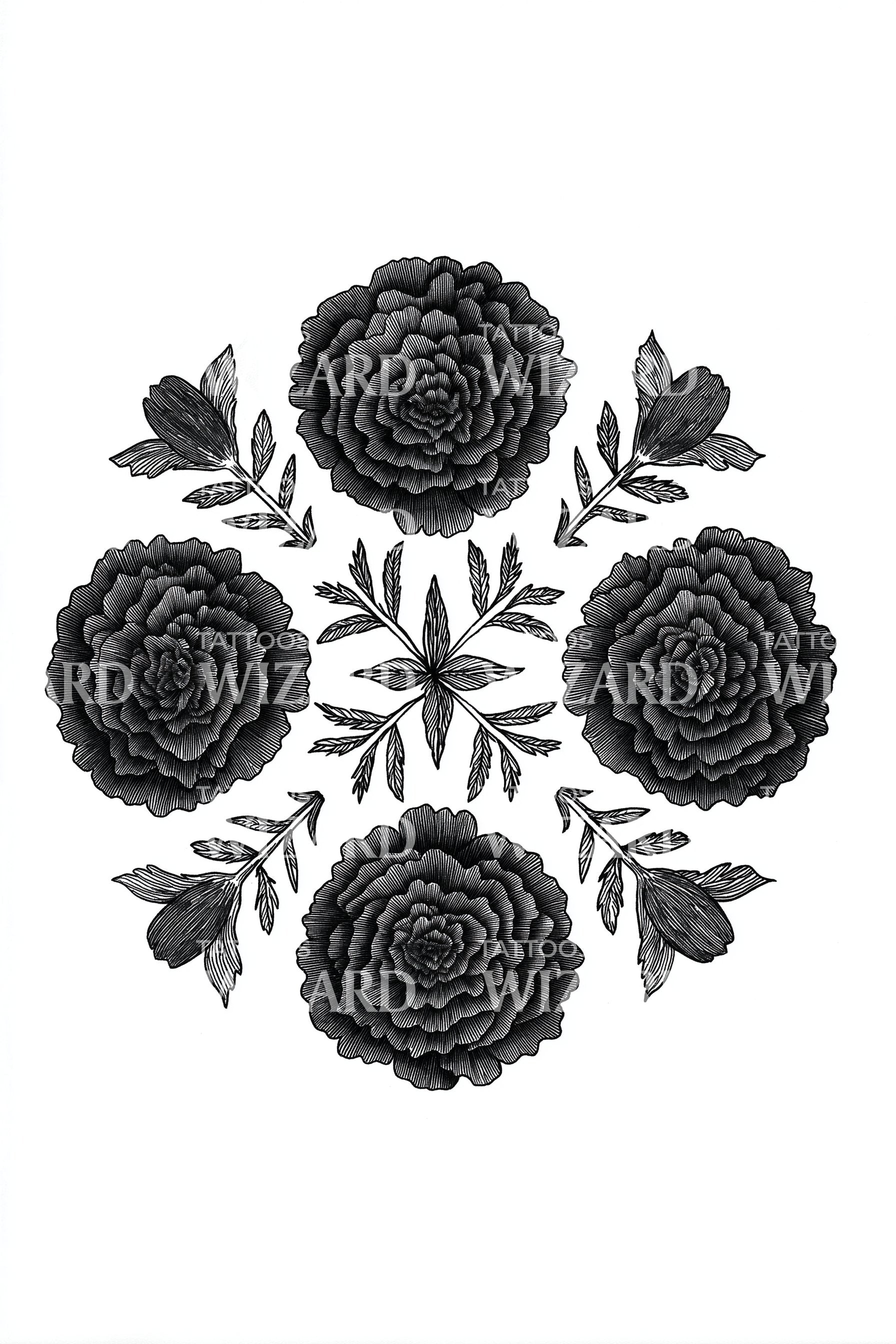 Погрузитесь в тёмную красоту этого тату дизайна с геометрической далией в стиле blackwork. Вписанная в идеальный круг, симметричная композиция демонстрирует замысловатые лепестки, закручивающиеся в завораживающую чёрную бездну. Этот дизайн сочетает симметрию и драматическую глубину далии, придавая вашей коллекции татуировок интенсивную ауру.
