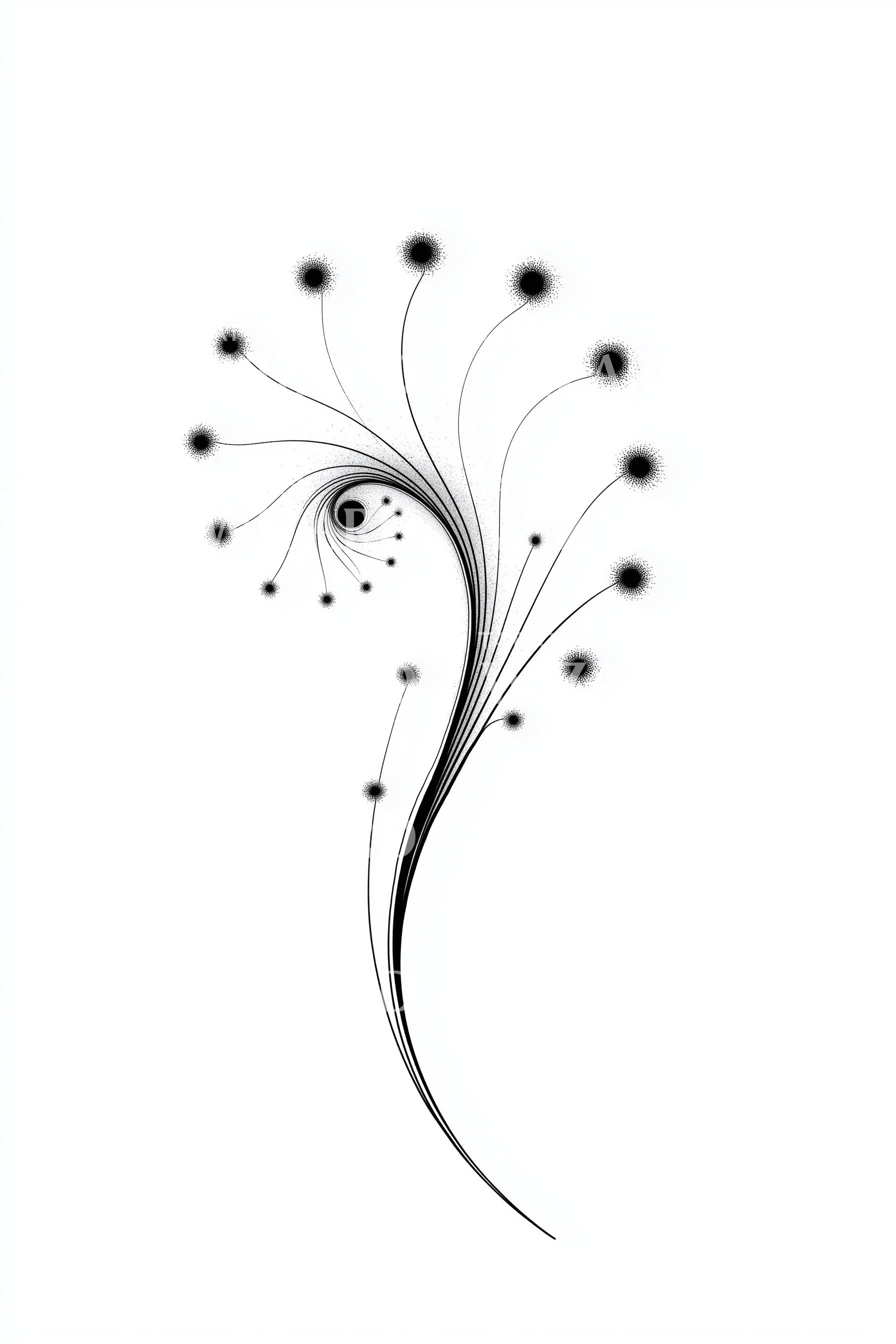 Этот изысканный дизайн татуировки в стиле тонкой линии безупречно передаёт естественную элегантность уносимого ветром семени одуванчика. С точными ботаническими деталями он символизирует течение и трансформацию. Идеально подходит для ценителей эстетической утончённости, это произведение искусства приносит красоту природы на вашу кожу с деликатной и стойкой грацией.