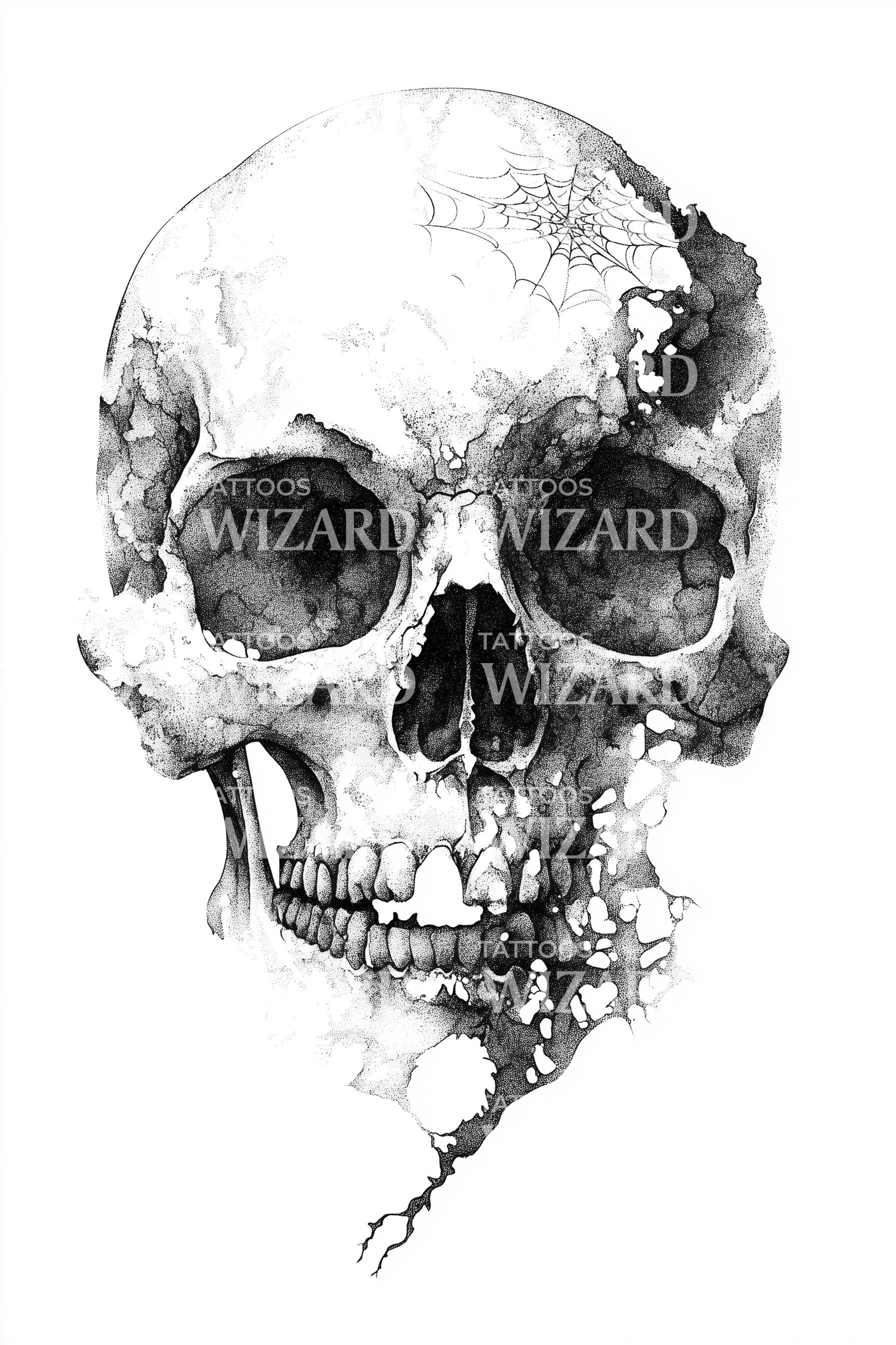 Погрузитесь в мистику смертного бытия с этим дизайном татуировки в стиле blackwork. Он художественно объединяет символику распада, рушащихся развалин и неизбежности старения, изображая череп и кости. Мощное напоминание о преходящести жизни, философски созвучное циклу жизни и смерти.