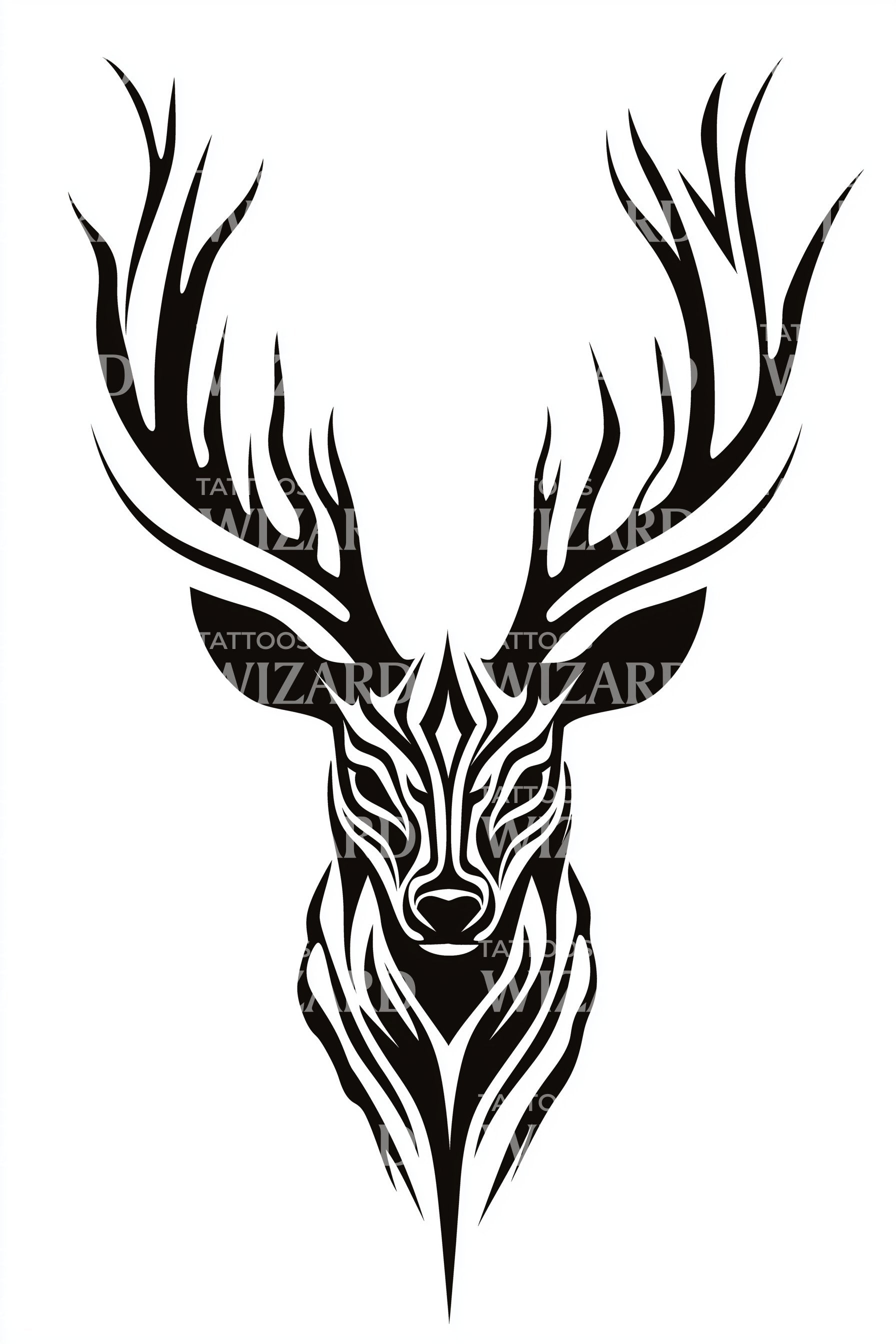 Antlered stag emerges in bold blackwork, carved from flowing lines and negative space, a forest spirit distilled to geometry. The deer totem speaks of vigilance, renewal, and grounded grace. Wearing this design feels like carrying quiet wilderness strength, steady breath, and wordless guidance through every path each day.