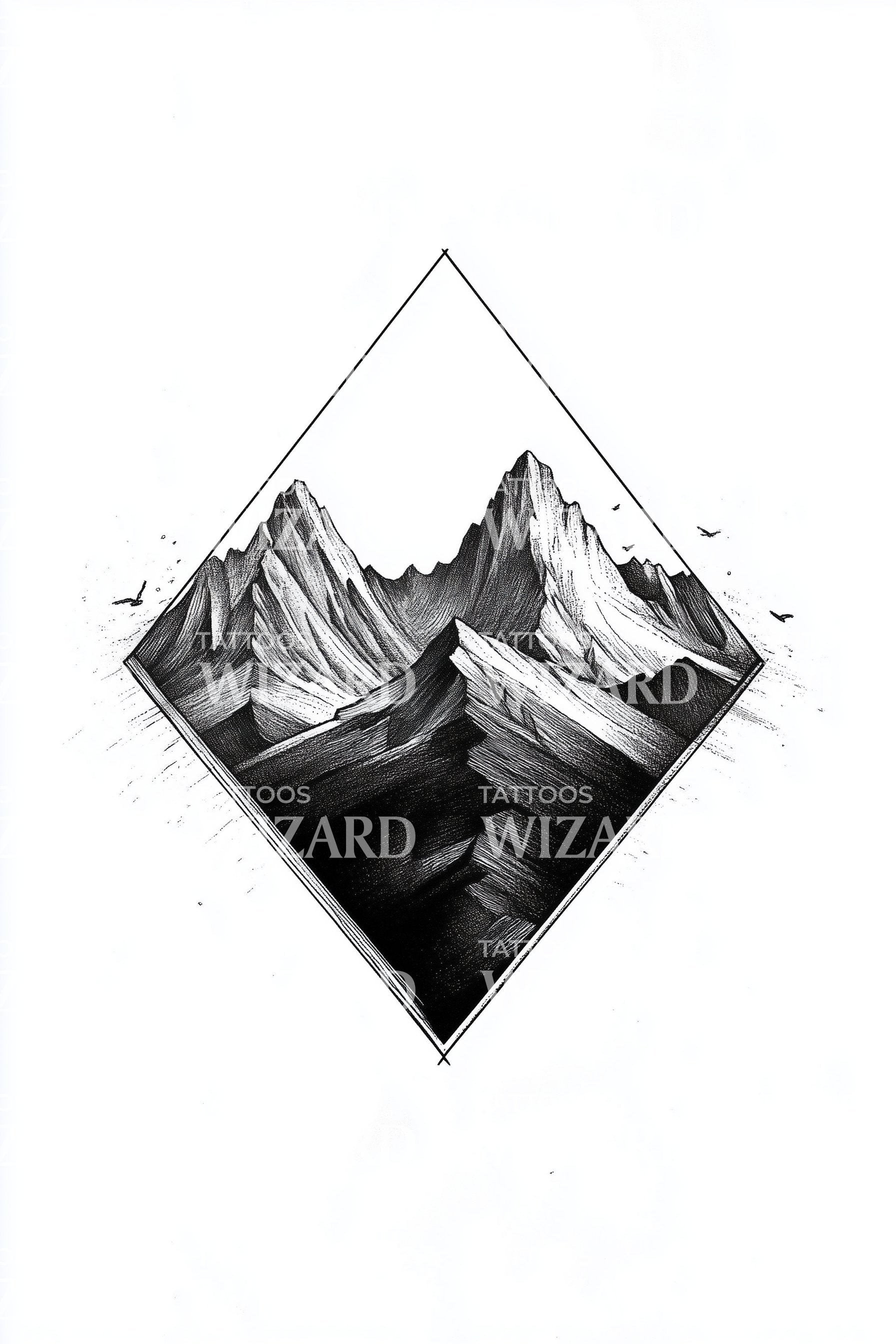 Погрузитесь в первозданную красоту природы с этим дизайном татуировки в стиле blackwork. Величественное воплощение темных и драматичных горных вершин, мастерски заключенных в тщательно вырезанный геометрический алмаз. Этот дизайн усиливает завораживающую тайну природы благодаря насыщенной детализации в стиле blackwork. Освободите свой дух приключений с оттенком элегантности.