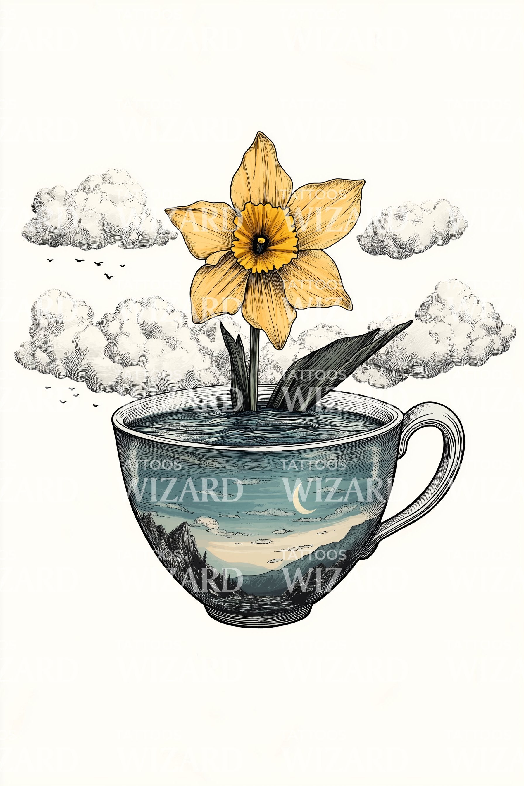 Погрузитесь в мечтательную эстетику этого акварельного тату-дизайна с восхитительным сочетанием изумрудных оттенков. Мотив чашки для чая, окружённый нежными цветами, придаёт нотку игривости, а акварельный эффект добавляет художественный штрих. Идеальный выбор для тех, кто ищет уникальную элегантность, запечатлённую на коже.