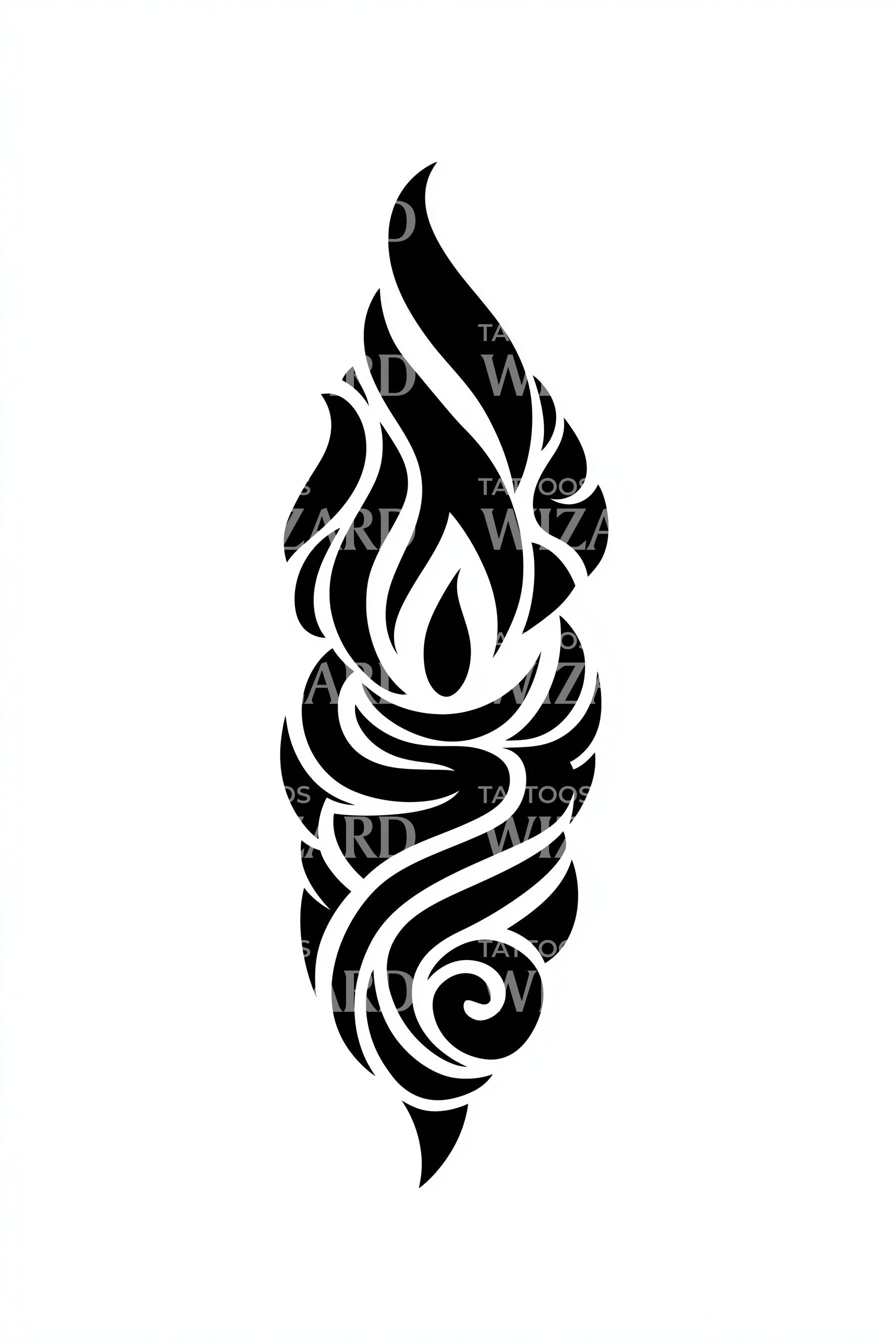 Окунитесь в стихии с этим дизайном татуировки в стиле blackwork. Он сочетает в себе племенные и абстрактные эстетические элементы, мастерски вплетая перья и пламя, воплощая изящество в каждом штрихе. Этот дизайн символизирует не только текучесть ветра, но и смелый дух, который касается с тонкой яростью.