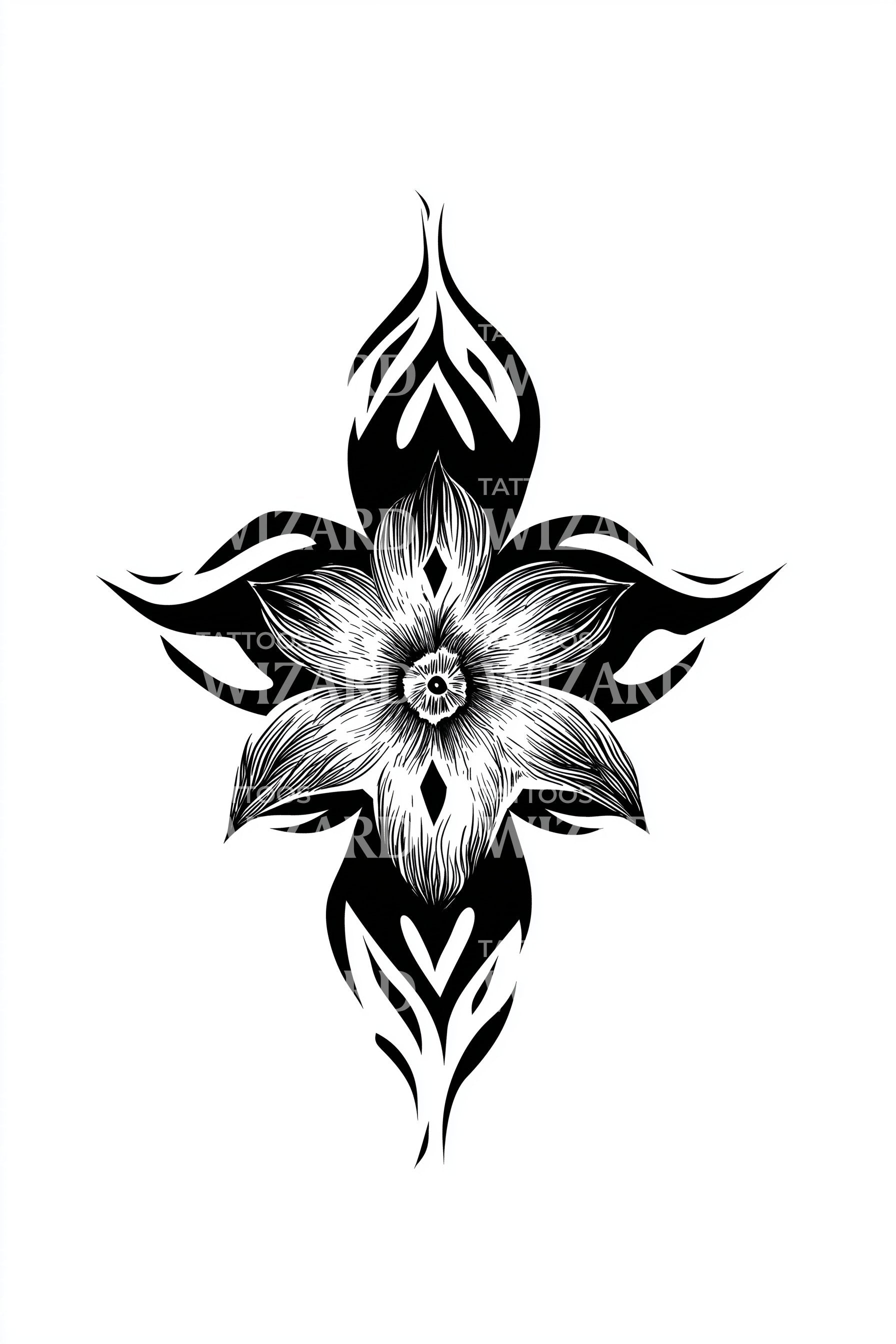 Ощутите изысканное сочетание природы и традиций с нашим дизайном татуировки в стиле племени. В центре — красиво узорчатый герб с искрами огненных мотивов и нежными деталями лепестков, наложенный на смелый чёрный цветок. Это мощное выражение племенной культуры, символ силы и красоты.