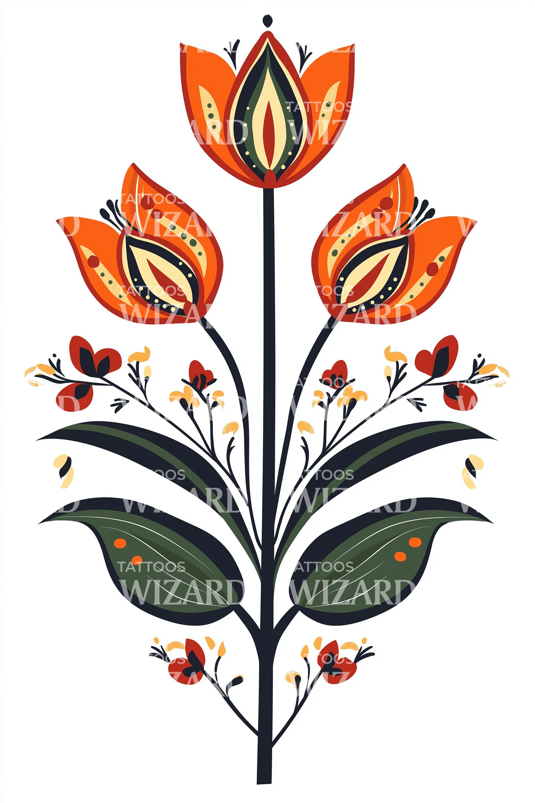 Scandinavian folk florals rise on a dark central tree, three tulip crowns glowing in ember orange, olive, and gold, laced with dotted patterns and ornate sweeping leaves. A neotrad emblem of renewal, ancestry, and protection. Wearing it feels grounded, warm, and quietly victorious, like spring returning home.